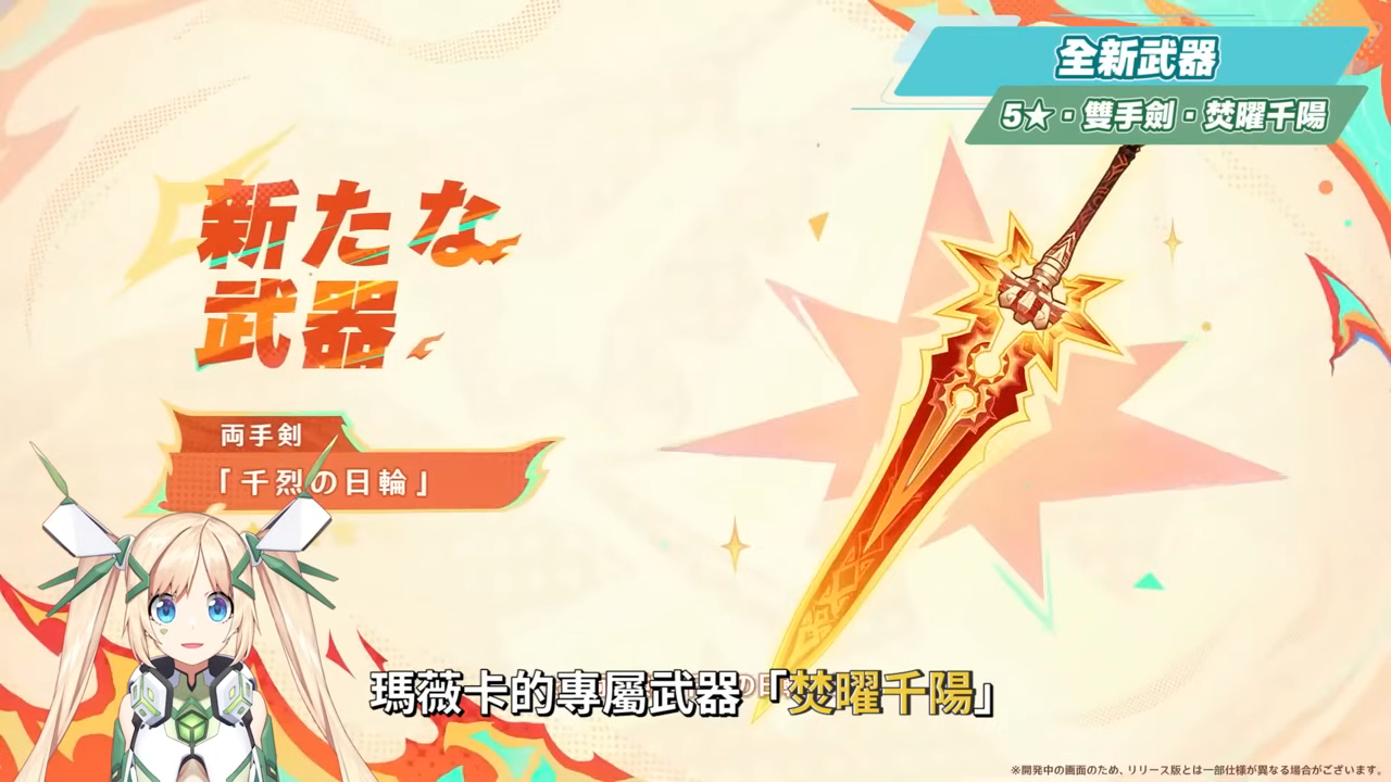瑪薇卡的專屬武器「焚曜千陽」,主屬性提供暴率,並且可以在施放元素戰技或元素爆發時,使自身獲得攻擊和暴傷提升,需要透過普攻或造成元素傷害來不斷維持BUFF,並且處於夜魂加持狀態下時,還能使效果額外提高,而若是處於後台的話,加成BUFF就不會隨著時間流逝而結束,不僅是相當契合瑪薇卡的武器,也是一個很不錯的輸出雙手劍,很多輸出型的大劍角色也可以使用。