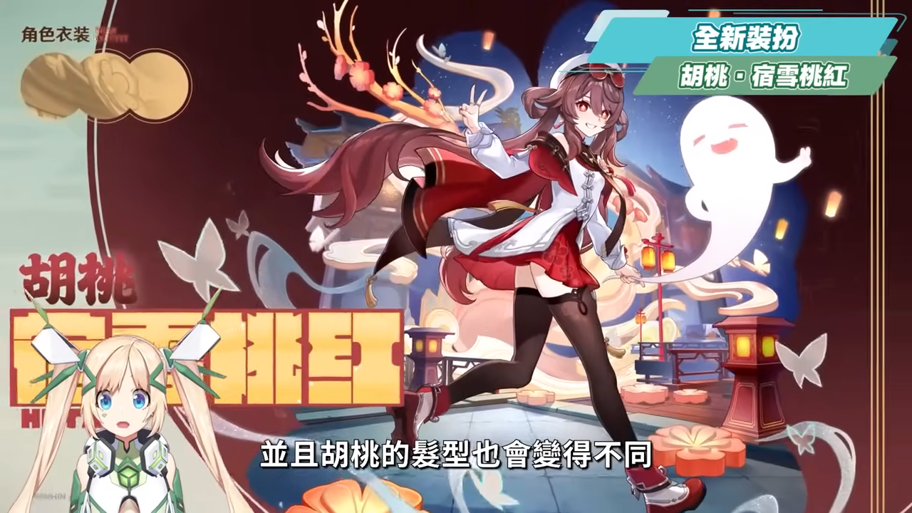 本次海燈節也會實裝2套全新的服裝,第一套是胡桃的全新服裝,也是香菱特別為他準備的禮物,請來了楓丹的知名服裝設計師Sit Down Please製作的「宿雪桃紅」,頭上還有個可愛的小墨鏡,並且胡桃的髮型也會變得不同,沒意外的話應該和過去一樣,版本特價期間為1350創世結晶、結束後就會恢復原價1680創世結晶。