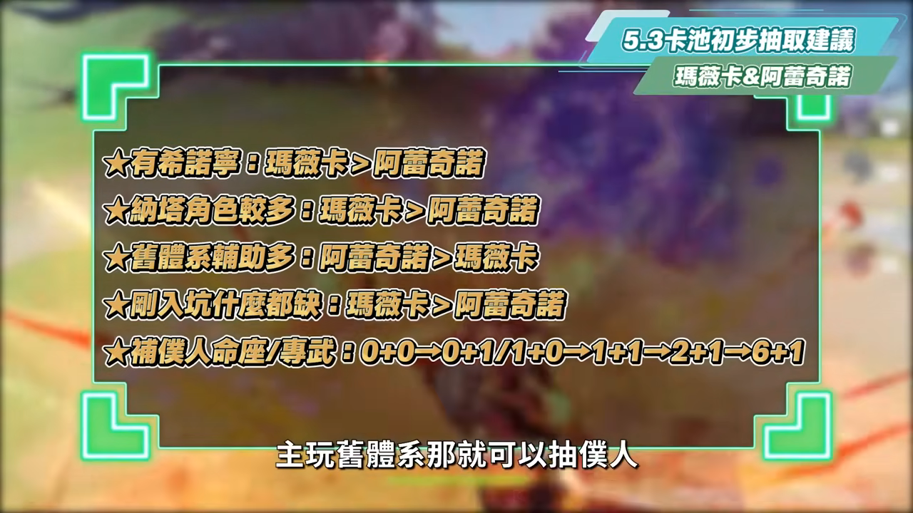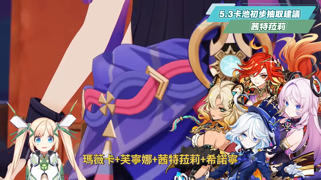 再來洛洛這裡也分享關於5.3卡池的初步抽取建議,由於瑪薇卡、阿蕾奇諾這兩個角色比較有一點重複的定位,因此先主要來分享一下關於這兩個角色的抽取方向。