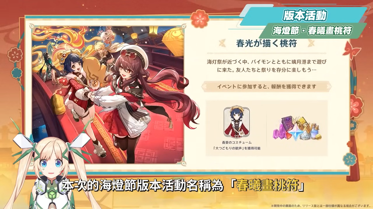 本次的海燈節版本活動名稱為「春曦畫桃符」,其中也會有很多小遊戲玩法,不過大部分也是過去的小遊戲再稍微加以改編。而這次劇情中也會出現鍾離,並且這次的他,竟然身上有帶錢呢!不過不是摩拉,而是璃月港最近流行的「吉語錢」,可以用來相互贈送,而且在璃月港中也會有一個很大的錢幣裝置,屆時也可以去互動一下,此外璃月港中也會佈置今年特有的霄燈,以及一些奇特圖案的屏風,圖案的背後也隱藏了一個名為「八奇煉桃都」的故事,也會是雲堇新戲唱的故事,後面也可以再次欣賞一下雲先生的演出。不過在歡樂的海燈節中,有一段畫面是胡桃在進行秘法大陣時說了一句話:「如果想我了,就看看這枝梅枝吧」不知道為什麼,總有種不安的感覺。