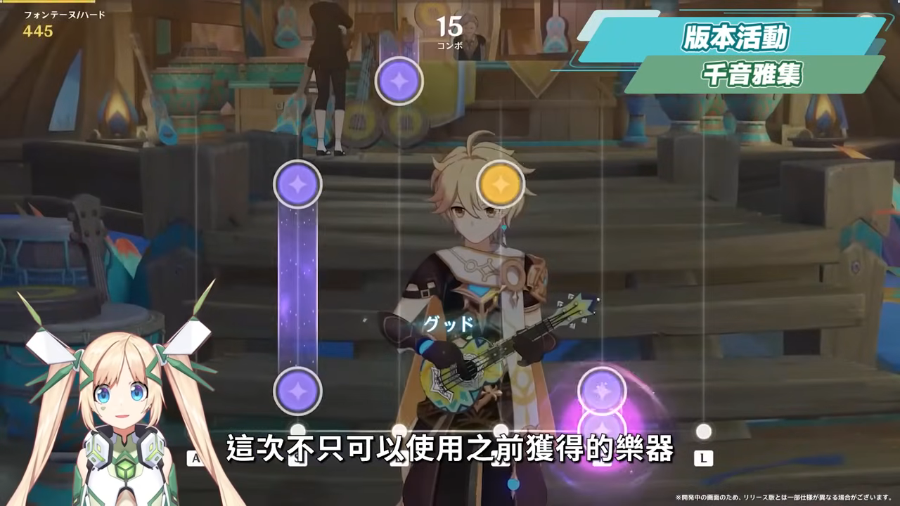 過往的音Game活動這次也同樣復刻,並且在未來會成為常駐的玩法,這次不只可以使用之前獲得的樂器,演奏提瓦特各處的音樂,也可以對已有的曲譜進行編輯,並且發表在官方的交流平台上,分享給其他玩家演奏。而全新的樂器悠可琴和聚聚鼓,也可以在納塔流泉之眾的「金貝樂鋪」中購買,每個15萬摩拉。