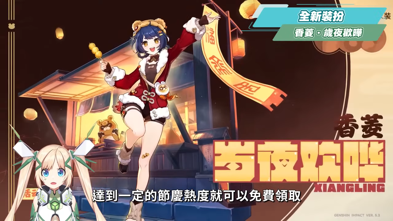另外一套則是香菱的全新服裝「歲夜歡譁」,也有很多可愛的鍋巴元素在上面,只要完成版本活動達到一定的節慶熱度就可以免費領取。