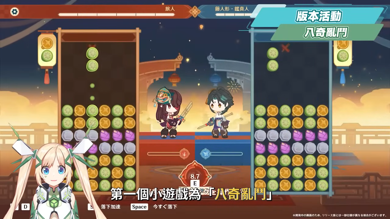 第一個小遊戲為「八奇亂鬥」,為消除類玩法,遊戲中可以透過和其他同色方塊相連加以消除,除了可以和NPC對決之外,後面也可以透過聯機玩法和其他玩家對戰。