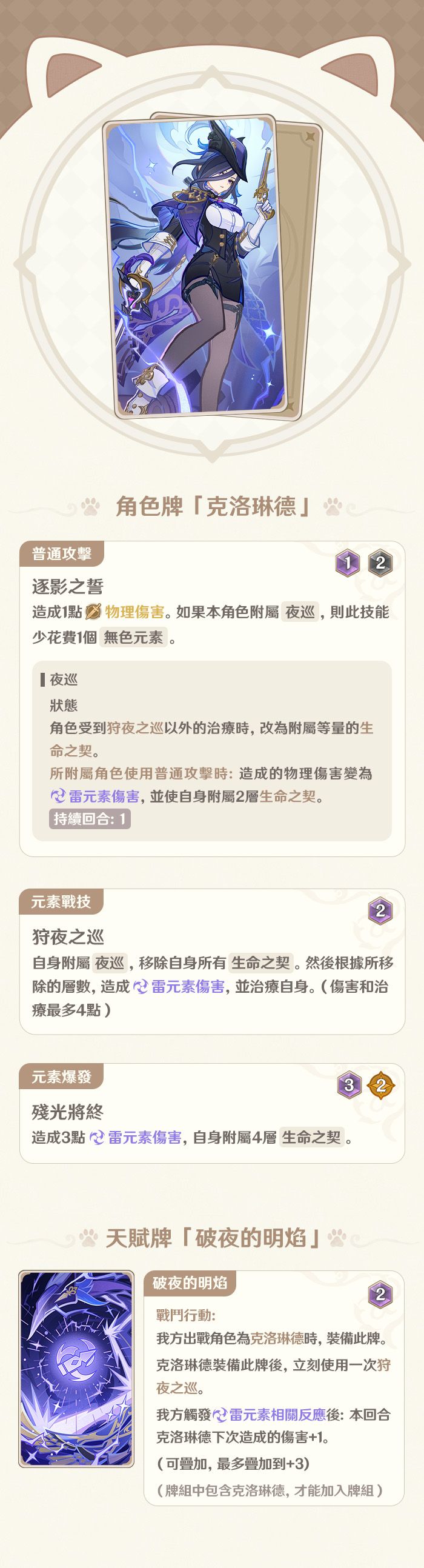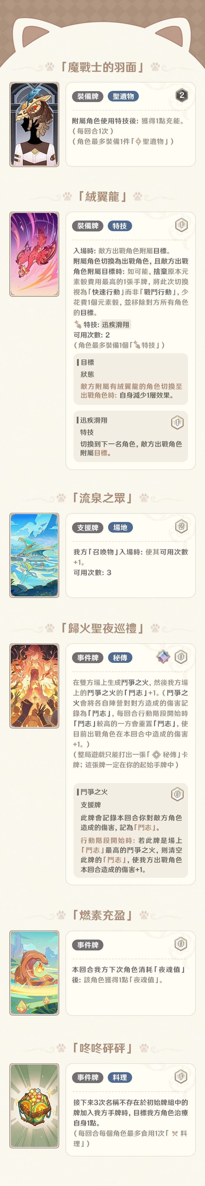 5.3版本更新後,前往貓尾酒館與角色進行邀約對局,達成指定挑戰目標可獲得角色牌及對應天賦牌。行動牌「魔戰士的羽面」、「絨翼龍」、「『流泉之眾』」、「歸火聖夜巡禮」、「燃素充盈」、「咚咚砰砰」可在卡牌商店中購買。