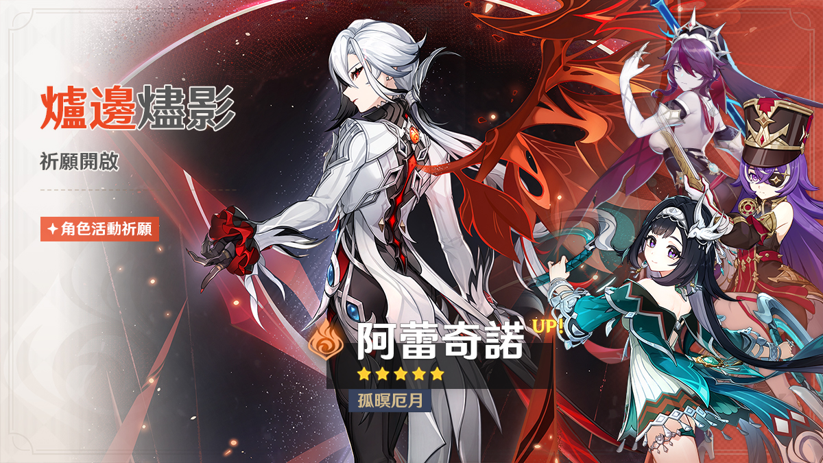 ●活動期間,限定五星角色「孤暝厄月·阿蕾奇諾(火)」的祈願抽取機率將大幅提升!