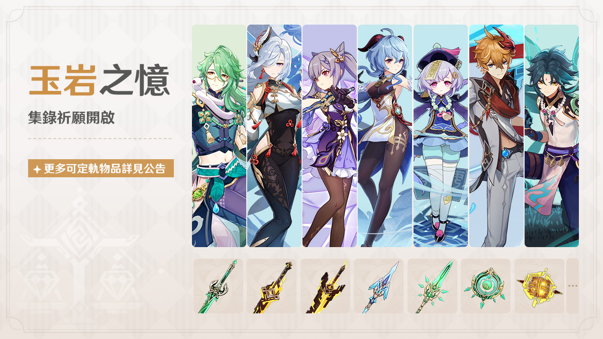 ●活動期間,旅行者可以在本期所有五星物品中自行選擇並定軌1個五星角色或五星武器作為本期「玉岩之憶」祈願出現機率提升的五星物品!
