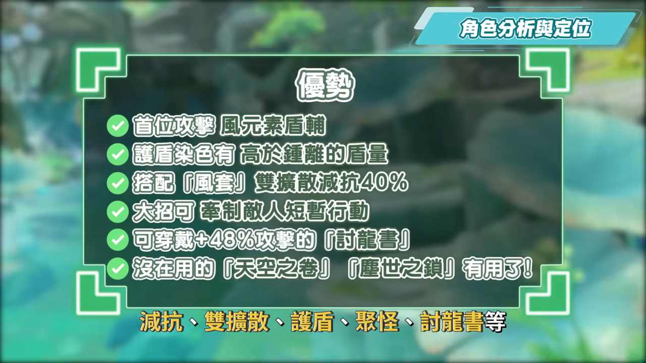 藍硯是四星風元素法器角色,定位為護盾輔助,也是目前遊戲中首位風盾,風元素角色的好處,就是可以穿上能減抗40%的「翠綠之影」4件套,而風元素的特性就是可以和水、火、冰、雷等可被擴散的元素產生染色,染上對應元素的護盾後,其護盾量甚至還可以比鍾離的還更厚,甚至也能做到雙擴散的效果,同時藍硯的技能組中,除了護盾之外,大招也附帶可以牽引敵人聚怪功用,再來作為法器的輔助角色,更是可以拿平民超強「討龍書」,作為攻擊盾,甚至還可以把放在背包中沒在用的「天空廁紙」和「富婆快樂球」都拿出來用了,因此藍硯也可以說是結合了減抗、雙擴散、護盾、聚怪、討龍書等多種輔助功能。