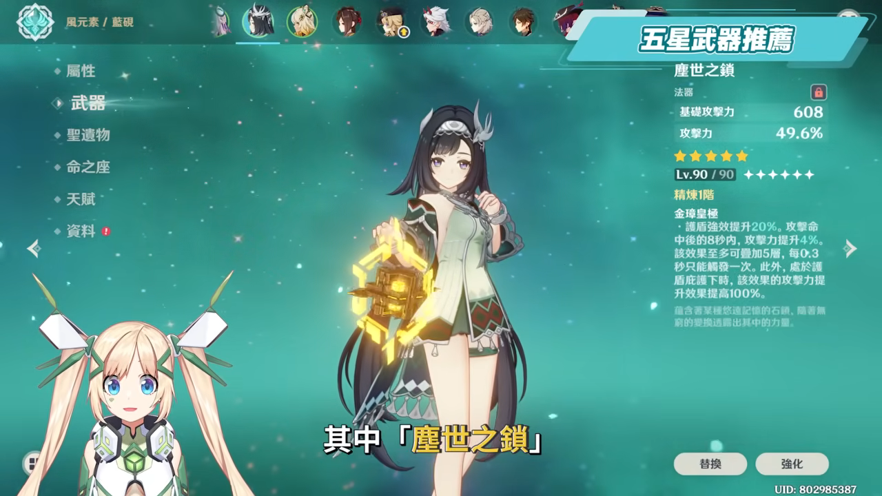 在武器選擇方面,最簡單的可以先從有提供攻擊力副屬性的武器來選擇,其中「塵世之鎖」不僅副屬性提供了大量的攻擊力之外,武器效果還可以再進一步提高護盾強效,並在攻擊命中後還可以再提高攻擊力。另外也可能有人先前歪出來後放著沒在用的「天空之卷」,也同樣可以憑藉武器提供的攻擊來直接提高藍硯的護盾量。其他也還有很多加攻擊力的五星武器,像是閒雲專武「鶴鳴餘音」,超高的攻擊白值和攻擊力,也能夠提供藍硯相當不錯的護盾量,基本上就是看有什麼就用什麼。