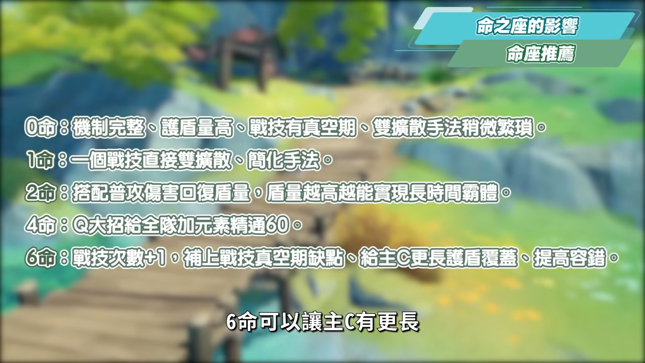最後的6命解鎖後可以使戰技的可使用次數+1,可以在護盾不小心碎了之後,能再快速續上新的護盾,並且也就可以在原本戰技會有的3.5秒空窗期中,再無縫銜接上新的護盾,搭配前面2命的普攻傷害恢復盾量,這個護盾效果加上風套與1命的無腦雙擴散減抗,在有染色盾的情況下,也可以說是比鍾離的盾覆蓋還要更長更強,而因此解鎖6命後也可以把多的戰技次數,盡量留在適當的時機點使用,又或是再搭配祭禮殘章讓使用的次數有更多容錯、隊伍的循環更舒適,也可以再稍微從天賦2的效果中去吃到一些精通轉化傷害的加成。