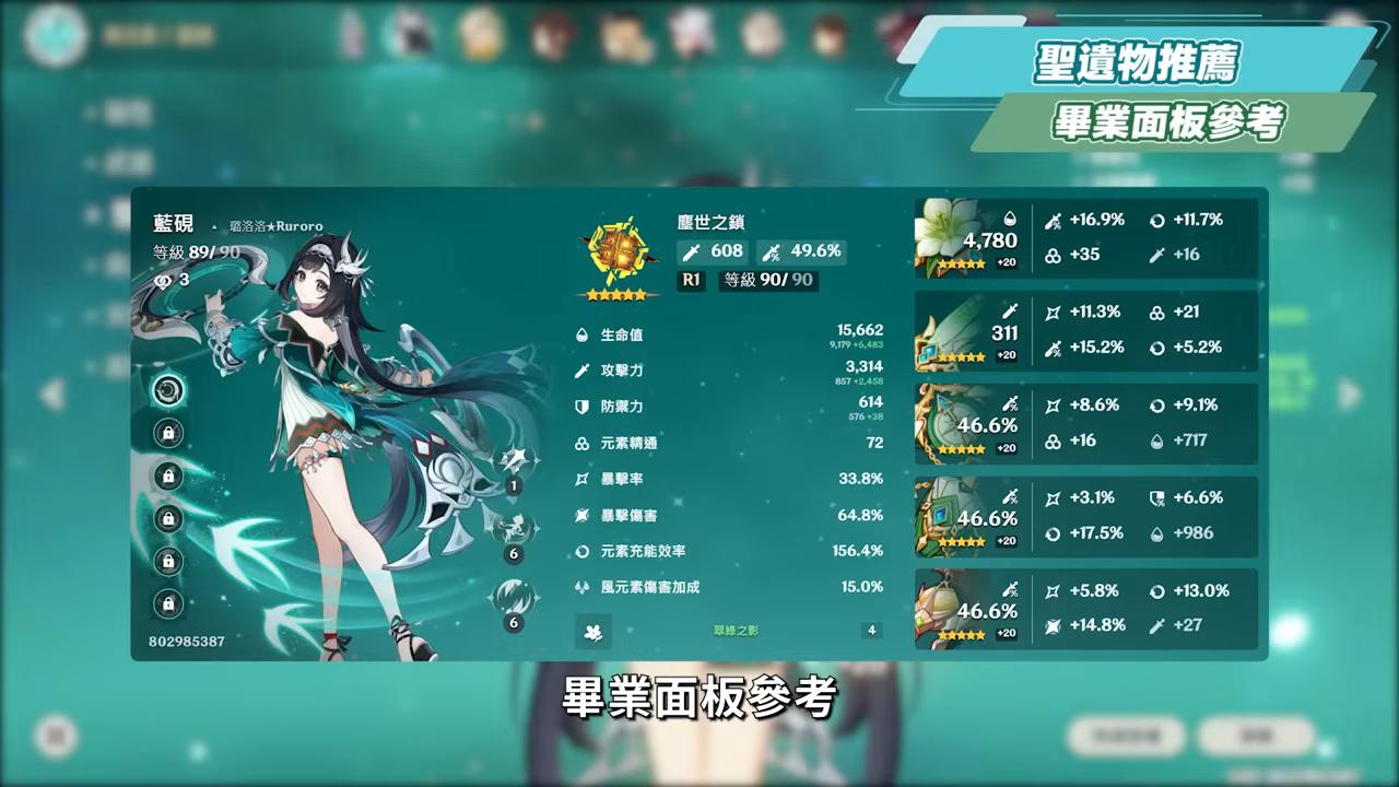 畢業面板參考,這邊就提供作為純護盾輔助的主流玩法面板參考,配戴攻擊副屬性類的武器,攻擊力可以落在2800~3000以上,若是搭配討龍書這種輔助武器,則攻擊力也是能堆多高就多高,大約會在2000附近。若是有需要堆疊充能,再把充能堆到約180%、攻擊力越高越好的配法。