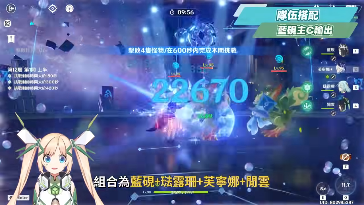 最後就是讓藍硯自己打輸出的一隊示範,組合為藍硯+琺露珊+芙寧娜+閒雲,這隊可以是讓藍硯玩主C下落的玩法,若是有6命閒雲,也可以讓閒雲在下落攻擊的過程中避免被擊中墜機,同樣的隊伍也可以換成魈這種需要護盾的輸出。