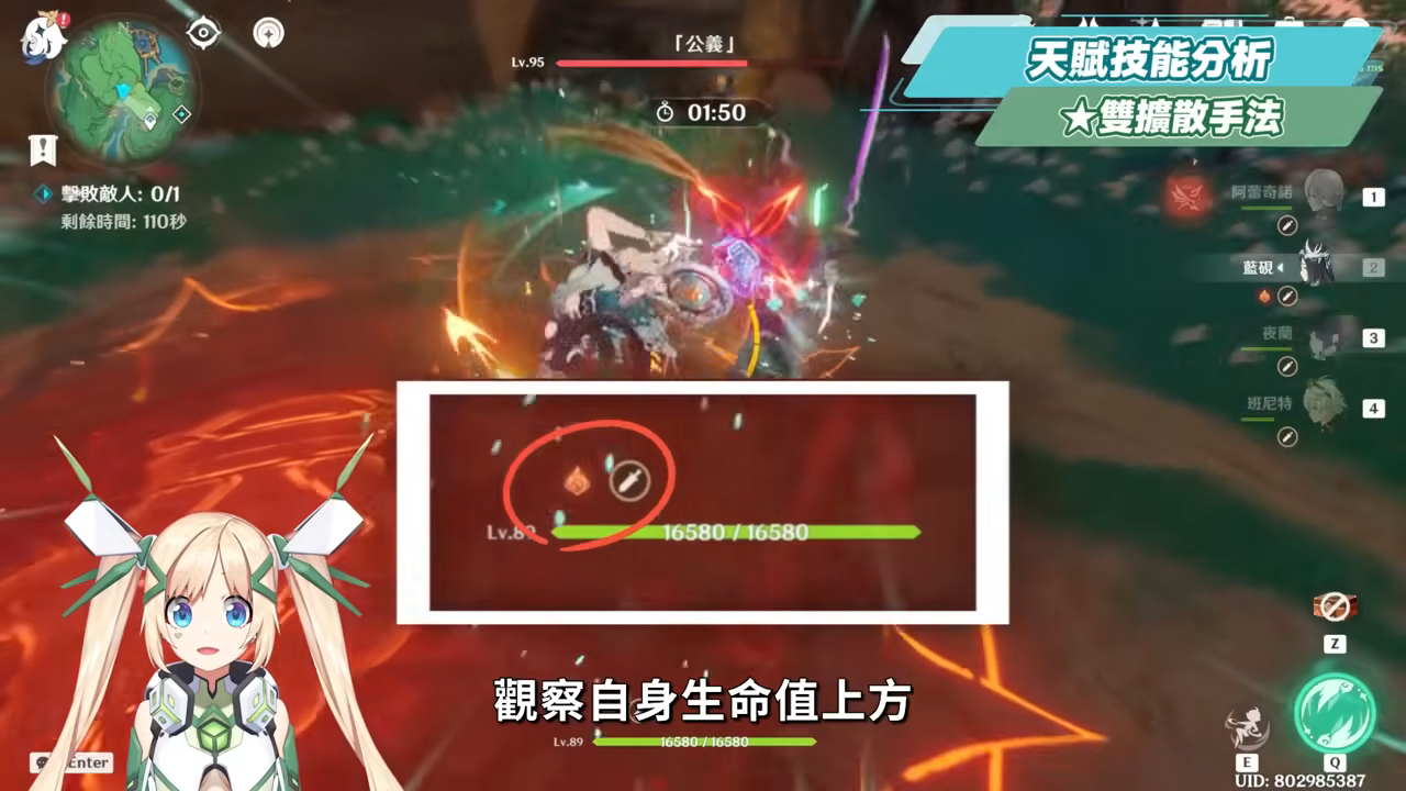 原本0命的藍硯會需要等落地後再普攻或開大一次來雙擴散,但因為1命之後會有2段「翦月環」,所以就變成開E後,風傷擴散了水元素觸發減水抗、並附魔上了火元素,讓第1段額外的「翦月環」給敵人掛上火元素,第2段「翦月環」風傷再次擴散了火元素觸發減火抗,這樣就可以一個動作直接減兩個元素抗性,手感也優化不少。那如果你本身就比較不追求雙擴散的話,其實1命也比較見仁見智,對於需要簡單觸發雙擴散減抗的人來說提昇就會比較明顯。