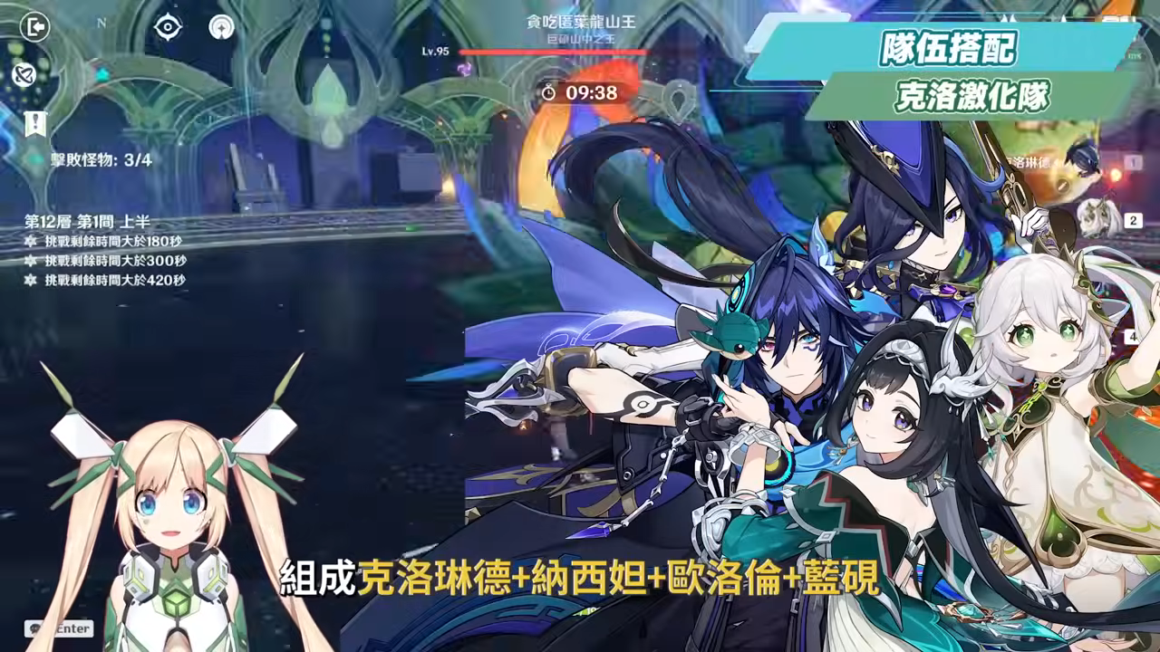 而在非滿命的克洛琳德隊伍中,有4命的藍硯也可以在激化隊中提高全隊一些精通,同時給到克洛琳德一定的生存保護,在對到一些有次數盾的敵人、或是想確保雷元素掛得更穩定,也可以把第二位雷元素角色換成歐洛倫,組成克洛琳德+納西妲+歐洛倫+藍硯。手法就可以是歐洛倫重擊掛雷(有祭禮弓可E),納西妲EQ,歐洛倫QE,藍硯E,克洛琳德E+普攻站場,Q收尾,再從納西妲的順序開始。