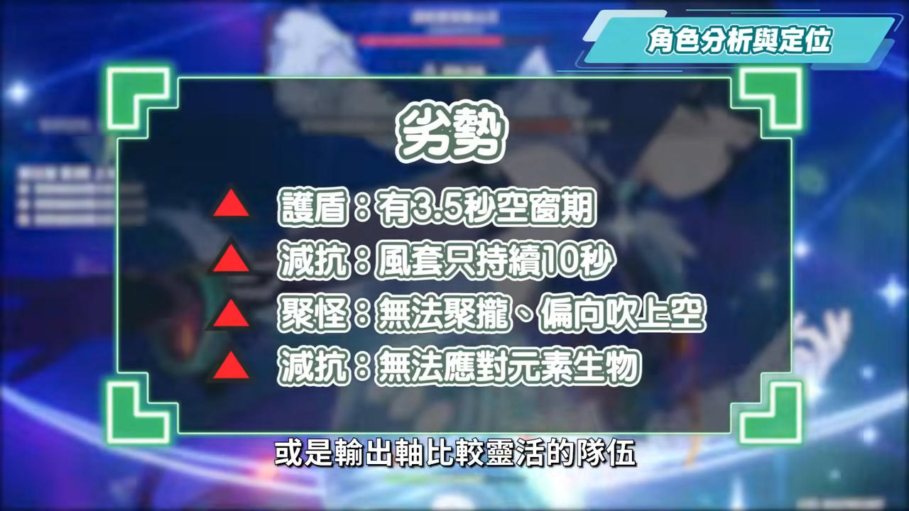 在一眾四星角色中,藍硯的機制確實表現十分不錯,但總體來說藍硯比較像是揉合了部分的鍾離護度硬度、和萬葉的雙擴散機制、搭配能加攻的討龍書,也有類似茜特菈莉這種盾輔一樣類似的功用,只是0命的狀態下,藍硯的護盾持續時間和冷卻時間之間是有3.5秒的空窗期的,可能平時鍾離開1次盾的時間,藍硯就需要開到2次,雙擴散的部分,以0命的機制,手法上也會稍微比較麻煩,甚至都可能佔據到其他BUFF存在時間,而減抗的部分雖然有「風套」4件提供高達40%的增幅,但風套的BUFF時間也相對比較短只有持續10秒,可能還不如希諾寧EAA踢完直接有15秒的減抗,而且風元素角色也比較不好應對像水形幻人這種元素生物去減抗主C的元素,此外藍硯聚怪的力道也沒有像萬葉那樣有能夠把群怪吸引至中心的感覺,比較偏向把敵人吹上半空,藉此稍微牽制中小型敵人的動作,因此藍硯總體來說,還是比較偏向是一個提高下限的角色,尤其是剛入坑的新手,或是操作比較不好、或是需要扛一些瞬間高傷害的技能,像是冰風組曲或是劍鬼的刀氣,藍硯的護盾可以提供到很不錯的保護能力,並且2命還可以再透過普攻傷害把損耗掉的盾量補回來,但在你有鍾離、茜特菈莉、萬葉、1命希諾寧,或是隊伍中的傷害量已經可以在暴斃前就把怪打死的強度的話,護盾其實也已經不是當前的重點,更多還是用在可能需要有提供抗打斷的角色存在,像是0命那維萊特、0命僕人、0命克洛琳德這種比較脆又要站場的輸出角,而風套4件只有10秒的持續時長,也會需要你搭配一些打短軸爆發、或是輸出軸比較靈活的隊伍。