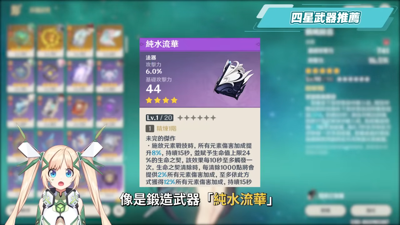 四星武器中攻擊力為副屬性的也有很多,像是鍛造武器「純水流華」、活動武器「證誓之明瞳」、「忍冬之果」、「嘟嘟可故事集」、「昭心」等等。