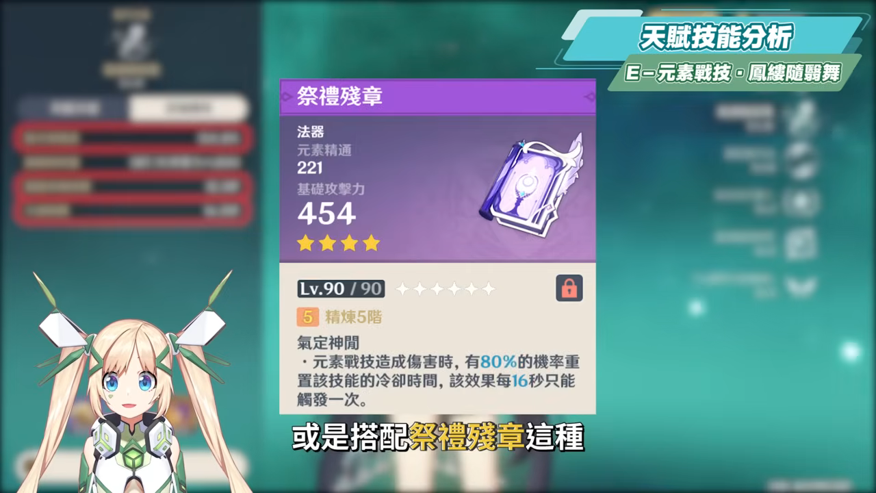 再來是可以提供其他輔助效果的武器,像是茜特菈莉的專武「祭星者之望」,提高元素精通之外、還能提供全隊角色增傷,持續時間也有不錯的覆蓋。又或是人人必備的一本滿精煉三星法器「討龍英傑譚」,可以讓下一位登場角色吃到超高攻擊加成,又正好藍硯的技能順序也會接在主C的上一位,所以武器效果也非常適用藍硯。最後就是若想直接體驗6命效果,也可以選擇滿精煉「祭禮殘章」,刷新戰技冷卻時間的同時也相當於可以多一次戰技能用,盡量用在需要續上新盾的時候,來給主C更長的護盾覆蓋。而若是打輸出就選雙暴類的法器,像是萊歐斯利專武「金流監督」,或是流浪者專武「圖萊杜拉的回憶」,根據自己有的法器去選就好。