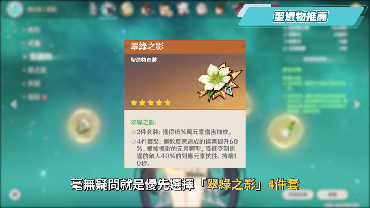 藍硯的聖遺物選擇方面,由於作為風元素輔助,因此最佳的聖遺物套裝毫無疑問就是優先選擇「翠綠之影」4件套,搭配雙擴散就可以一次給兩種元素降低抗性40%,是風元素輔助的最大優勢,就算聖遺物主屬性不對、也要優先湊成4件套來穿戴。若是想玩站場的直傷藍硯,通常也會建議搭配芙寧娜,因此就可以穿戴搭配芙芙萬用的「逐影獵人」4件套。或是其他風傷、攻擊2+2混搭配法。
