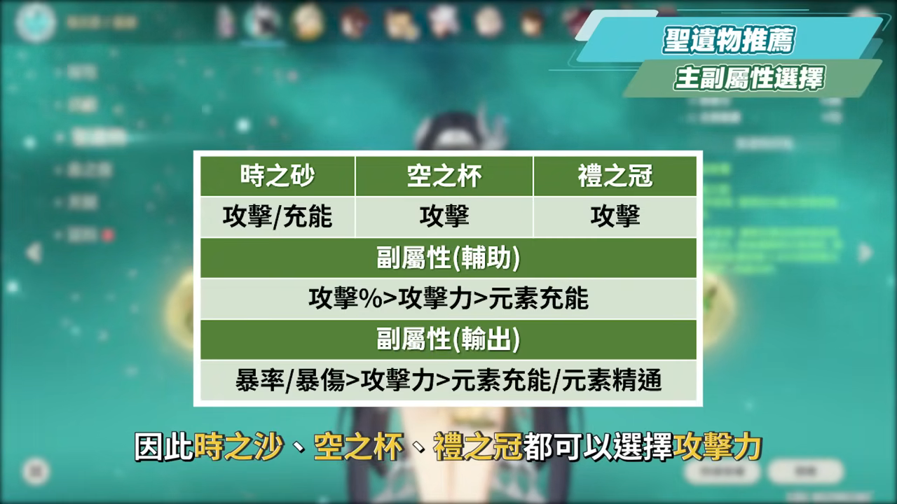 聖遺物主副屬性選擇方面,由於藍硯的護盾量主要依據的是攻擊力屬性,因此時之沙、空之杯、禮之冠都可以選擇攻擊力,琴團長,拿來吧你!那如果你對大招有比較高的需求性,也可以將時之沙換成元素充能。若是走輸出定位,則可以考慮攻擊力的時之沙、風元素傷害或攻擊力的空之杯、雙暴頭。副屬性的部分則可以優先考慮攻擊力%、攻擊力、元素充能,有要打直傷輸出再考慮雙暴或帶一點元素精通。