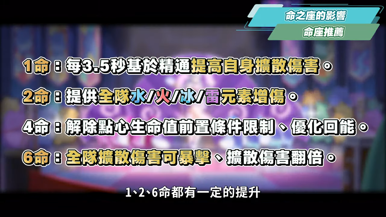 解鎖6命後,全隊的擴散傷害都可以造成暴擊,固定為30%暴率、100%暴傷,為獨立傷害加成,給隊伍的擴散傷害也相當於是翻倍。
