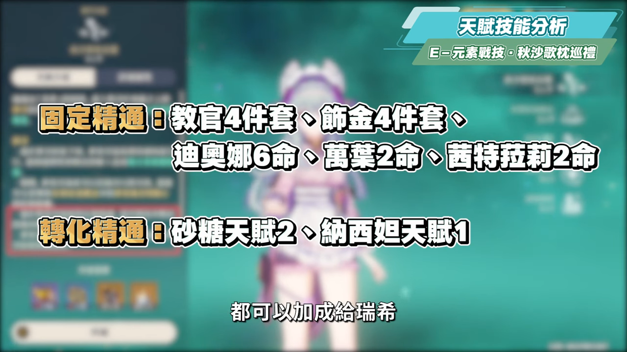 解鎖固有天賦2,在戰技持續時間內,只要隊友造成水/火/冰/雷任意一種元素傷害命中敵人時,就會使瑞希獲得元素精通提高100點,持續4秒,但不能透過不同元素來重複疊加,只有一次,若是染色過後的風元素傷害、或是擴散傷害也都算,因此搭配瑞希的特性和隊伍,效果也可以看成是常駐維持。