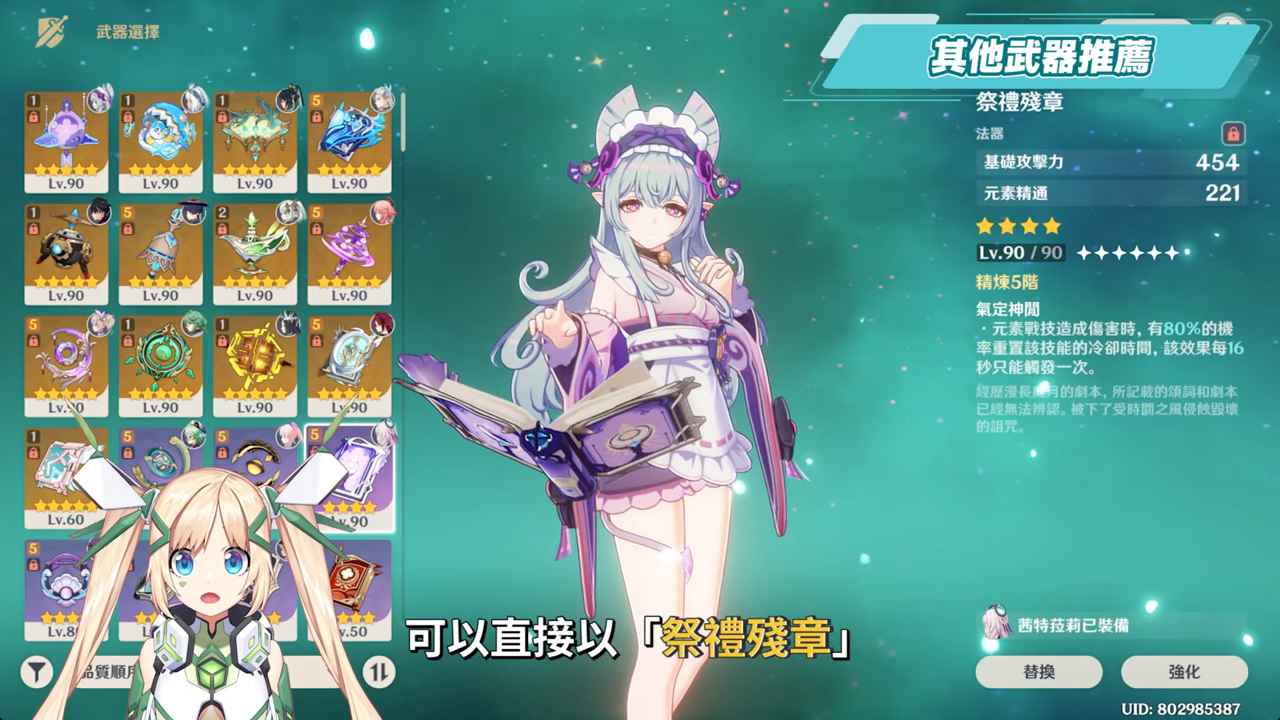 洛洛會覺得若沒有專武,可以直接以「祭禮殘章」作為畢業武器選項,和茜特菈莉一樣,不只提供不錯的精通數值之外,搭配武器效果來重置戰技冷卻時間,不只可以加快回能、能夠捨棄充能沙,還能讓戰技原本有的真空期直接無縫銜接,延長站場輸出時間,讓瑞希的飄浮時間可以持續很久,但最好要高精煉,才能比較好觸發武器的重置效果。其他四星武器就同樣找元素精通、或是元素充能的武器來選擇,元素精通的四星武器有「流浪的晚星」、或是三星「魔導緒論」。充能武器也可以選擇鍛造武器「盈滿之實」,除了充能也有精通,其他武器就不如鍛造武器了,因此建議沒有「祭禮殘章」,還是可以看當期武器池有沒有需要的五星武器,可以順便撈。