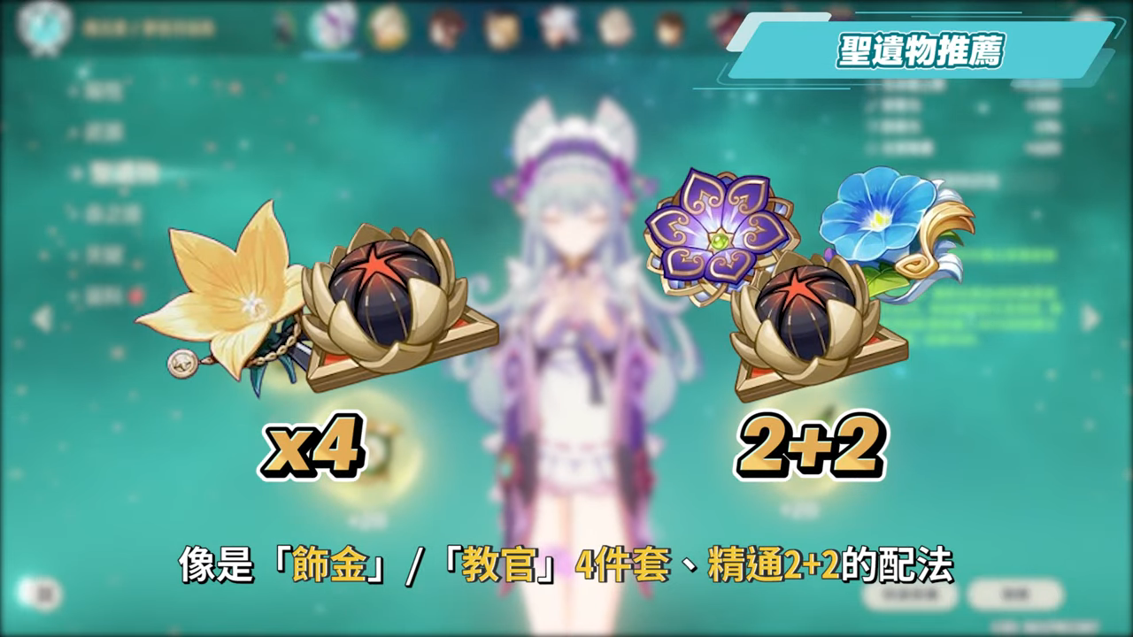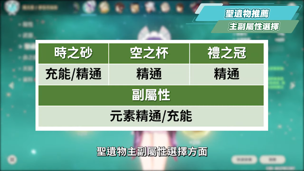 聖遺物主副屬性選擇方面,若不是搭配祭禮殘章或是充能向武器,時之沙建議選擇元素充能,此外則可以選擇元素精通,空之杯和禮之冠都選擇元素精通。