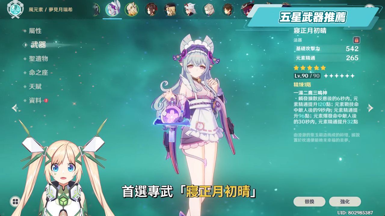 夢見月瑞希的武器推薦首選專武「寢正月初晴」,副屬性提供元素精通,效果是在觸發擴散反應後、戰技命中、大招命中敵人後,使自身元素精通提高,一共可以獲得三層的元素精通疊加,直接就加了500多元素精通。也因為砂糖也是主打擴散傷害的角色,因此這把武器對於砂糖來說也是很不錯的武器。其次可以考慮的五星武器可以選擇其他副屬性為元素精通的武器,像是茜特菈莉的專武「祭星者之望」,可以直接獲得100點元素精通提升,只是後續透過護盾所提供的增傷吃不到。此外納西妲的專武「千夜浮夢」,需要隊伍中搭配同元素隊友,但瑞希的組隊大部分都是以單風或是雙風為主,因此搭配這把武器只能獲得0~1層的精通提升,所以會略遜於「祭星者之望」。