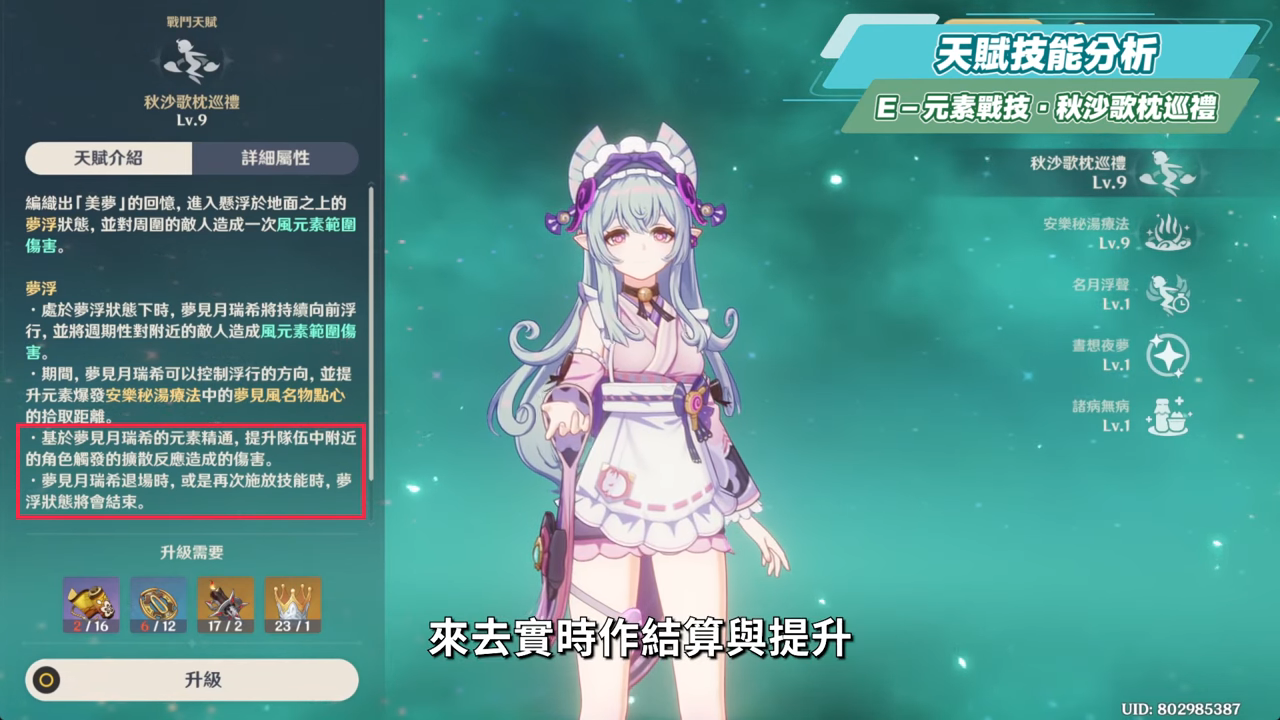 解鎖固有天賦1,觸發擴散反應後,可以延長瑞希的飄浮時間,每輪戰技最多延長2次,每次2.5秒,因此一次戰技就可以最多有10秒的飄浮時間,但戰技有15秒的冷卻,因此還是有約5秒的空窗期。主要是可以用來切換成其他隊友來開後台技能。