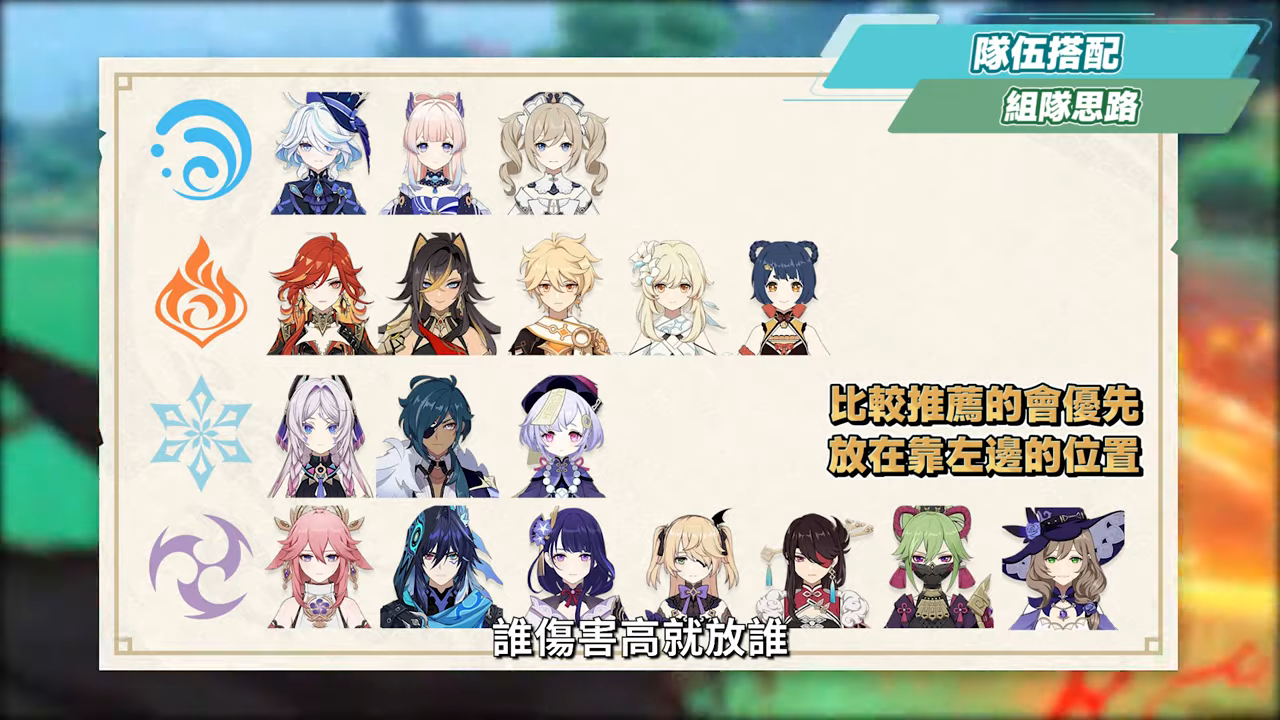 夢見月瑞希的隊友選擇方面也很簡單,只要搭配能夠脫手打後台傷害的隊友即可,因此像是芙寧娜、瑪薇卡、茜特菈莉、八重神子、菲謝爾、歐洛倫…這些角色都可以,誰傷害高就放誰,又或是可以後台掛元素的,搭配精通打擴散反應,也因為角色比較多,因此洛洛也把四種元素的後台傷害隊友都整理在這裡提供參考,比較推薦的會優先放在靠左邊的位置。而雖然擴散反應需要搭配水/火/冰/雷等角色,但其實瑞希的隊伍只要至少有一名四種元素的其中一種隊友即可,所以你想要隊伍中有一名其他擴散元素以外的隊友也可以,像是阿貝多,戰技有電梯,可以讓瑞希坐電梯上升不被打的同時,阿貝多大招還會加125點元素精通。又或是草+雷打激化,能玩的隊伍其實很多,但主要就偏於娛樂,畢竟現在納塔時代的傷害倍率實在是不能和瑞希來比較的。