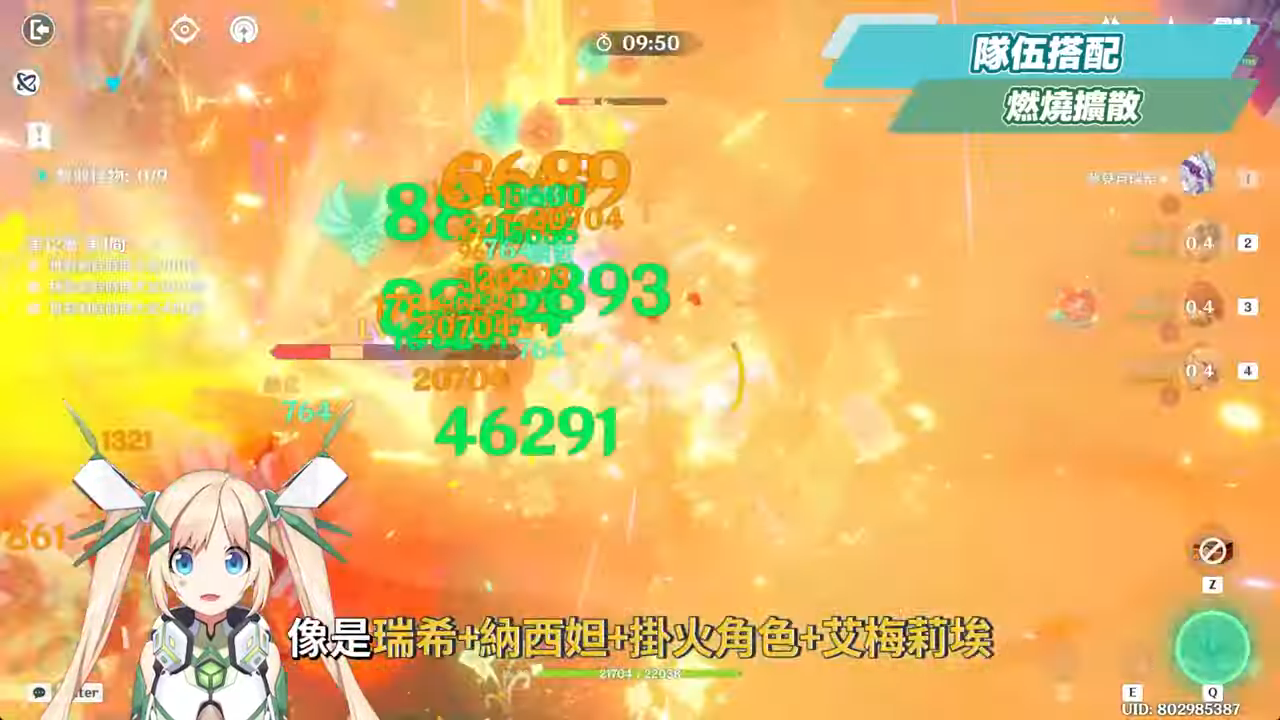 前面有說瑞希的隊伍其實並沒有綁四種元素,所以也可以用搭配其他同樣也吃精通的反應隊伍,像是瑞希+納西妲+掛火角色+艾梅莉埃來打燃燒+擴散。納西妲作為其中提供隊友精通加成的輔助,而掛火角色則和艾梅莉埃搭配打燃燒反應,瑞希則在前台安逸飄浮,自身也可以透過吃點心來給自己回復血量,因此也不用擔心在前台被燒死。