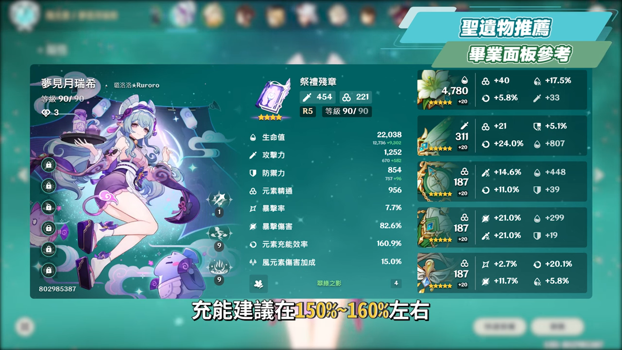 瑞希的畢業面板參考,可以優先確保元素充能,若是單風的話,充能建議在150%~160%左右,若是雙風的話,則可以降低在130%。充能面板足夠後,就可以全力堆精通,至少850以上、理想情況最好在1000點以上。提高治療量和擴散傷害。