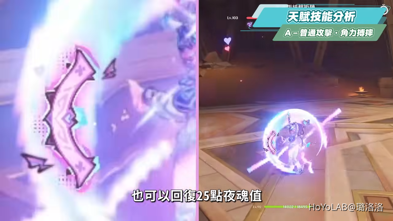又或是在一落地後,趕快銜接上下一輪E,就可以回到加強抗打斷的狀態中,也因為瓦雷莎動作並沒有什麼明顯的前搖,所以就不需要一落地後又接閃避了。而瓦雷莎的夜魂值上限為40點,搭配上首次的EAA流程結束後,夜魂值正好回滿,讓瓦雷莎也進入戴面具的狀態,此時就會再獲得一次額外短E的次數,並提高元素戰技造成的傷害,也等於又可以再次施放一次EAA的下落攻擊循環。