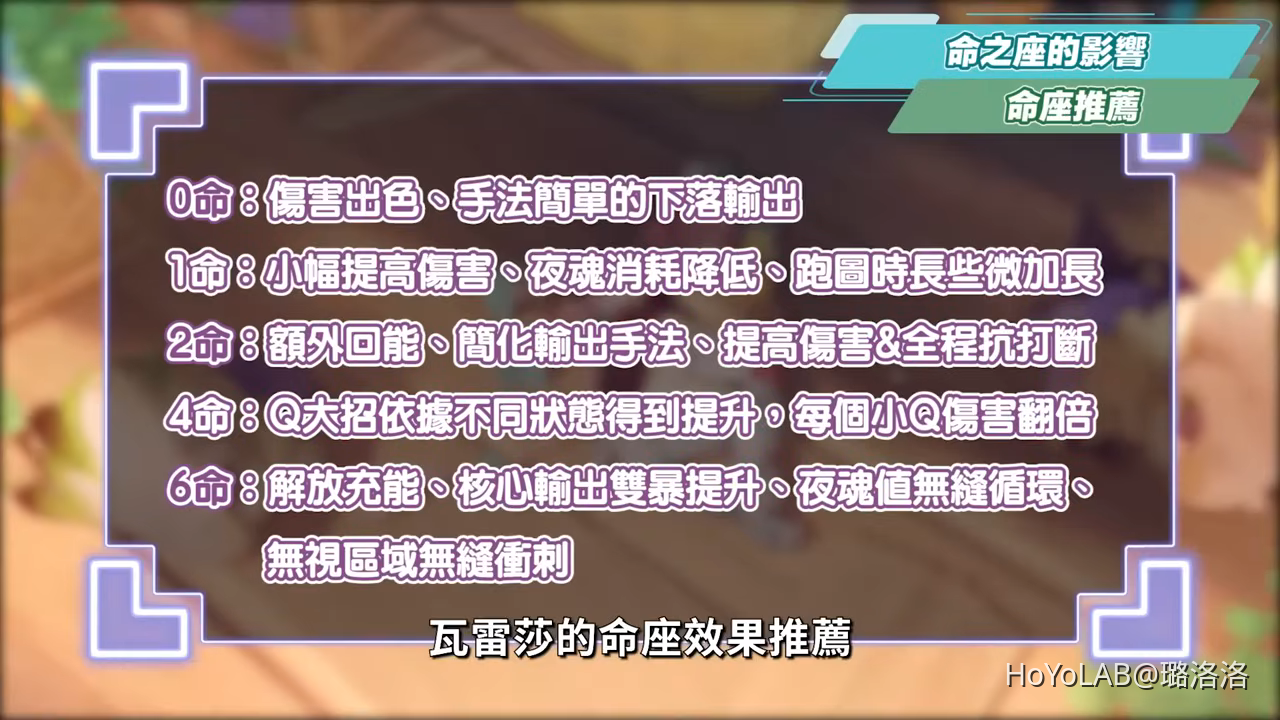 瓦雷莎的命座效果推薦,0命的瓦雷莎就已經有十分出色的輸出能力,1命主要優化手感,傷害算是小提升,2命開始有明顯的倍率與機制上的改變,讓輸出流程從EAAEAAQ,變成EAAQ的重複循環,而且傷害倍增,4命雖然也是難得比較不幽默的過渡命座,但一般來說還是資本雄厚的建議直上6命,體驗傷害爆炸、跑圖超爽的音速牛牛。