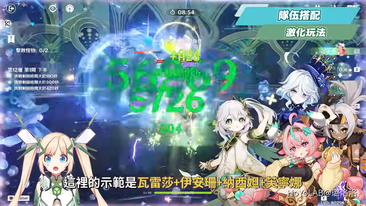 最後就是做為雷元素,也可以和草元素組合來玩激化反應,若是有2命納西妲的話還可以再加一個減防乘區的收益,這裡的示範是瓦雷莎+伊安珊+納西妲+芙寧娜,若是這裡的芙寧娜不是6命,也可以將納西妲換成白朮,又或是再組成平民一點的瓦雷莎+伊安珊+萬葉/藍硯+瑤瑤,同樣也可以根據自己的角色池養成情況來去配置更多不同的組合。