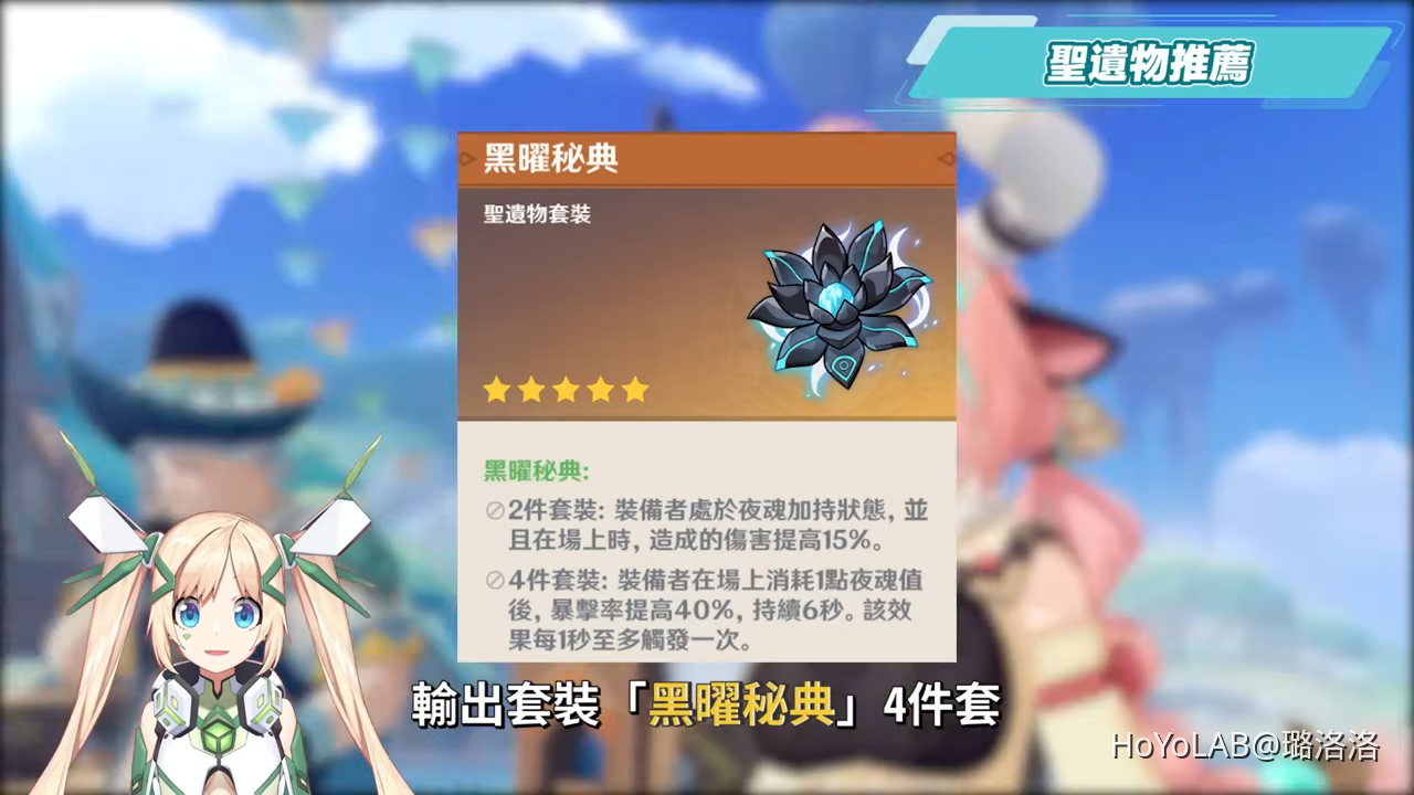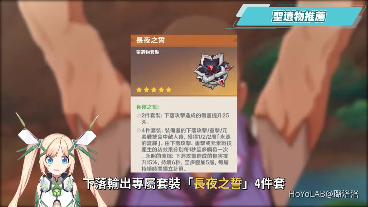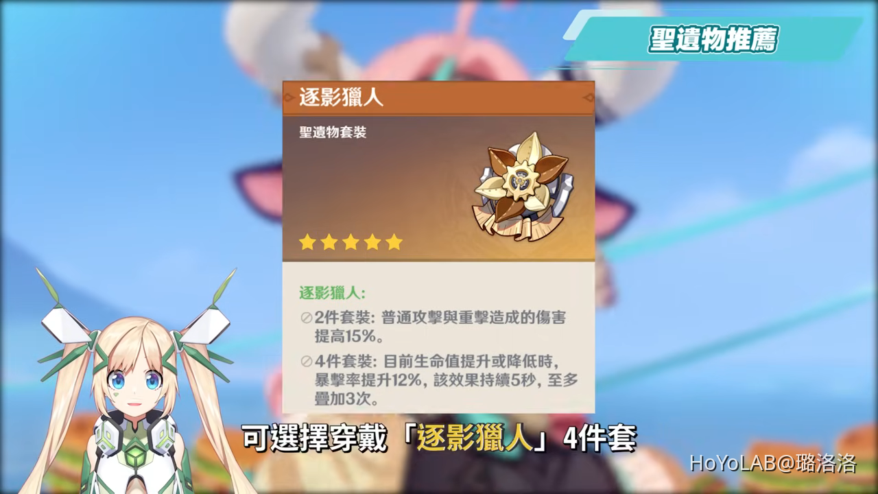 不過也因為下落套的聖遺物是這一版本剛出,比較不容易有人這一個版本就刷出完美的畢業套裝,因此過渡時期可以選擇像是搭配芙寧娜時,可選擇穿戴「逐影獵人」4件套,可以稍微再吃到重擊相關的加成。