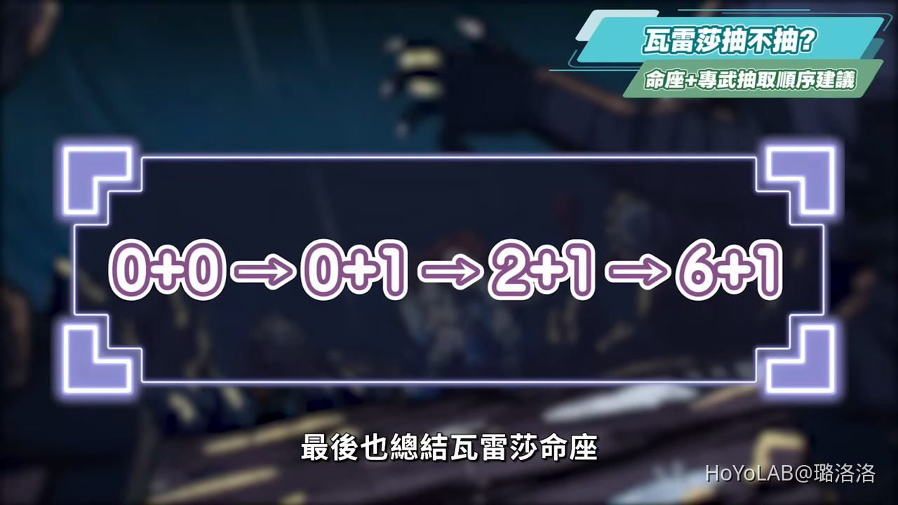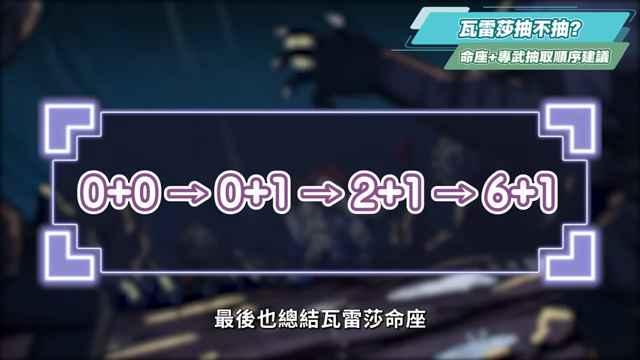 最後也總結瓦雷莎命座搭配專武的抽取順序建議,假如喜歡瓦雷莎,抽到0命就已經可以作為幻想真境劇詩的雷元素輸出對策角了,而角色池中人權輔助培養得夠多,那麼深境螺旋也是綽綽有餘,而若是還想再提升瓦雷莎的傷害,專武的加成會比1命的加成多,因此可以考慮抽專武,或是在高精煉四風原典或其他雙暴五星武器的情況下,也可以盡量往2命去抽,最後就是直上6命的課長大佬,享受完全體的音速牛牛。
