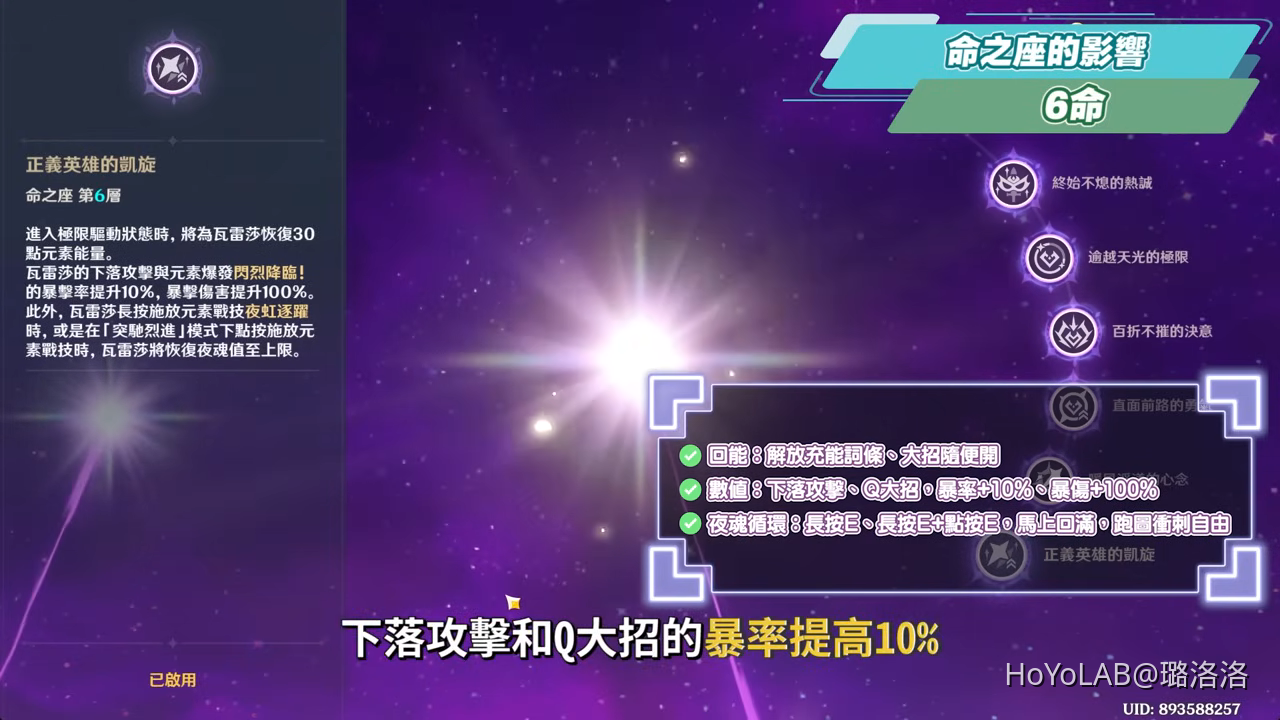 最後的6命就是簡單暴力的一個拉抬,在回能方面,瓦雷莎處於極限驅動狀態就可以獲得30點能量,加上前面2命還會在下落攻擊命中敵人時回復11.5能量,瓦雷莎至此就不用在聖遺物副詞條上還要堆個幾條充能,可以說是完全解放,大招隨便開。在數值方面,下落攻擊和Q大招的暴率提高10%、暴傷提高100%,最後是夜魂值循環上,在長按E進入圈圈腿狀態。或是在圈圈腿狀態點按E後,都可以直接將夜魂值回滿,也就可以馬上進入戴面具的強化狀態。