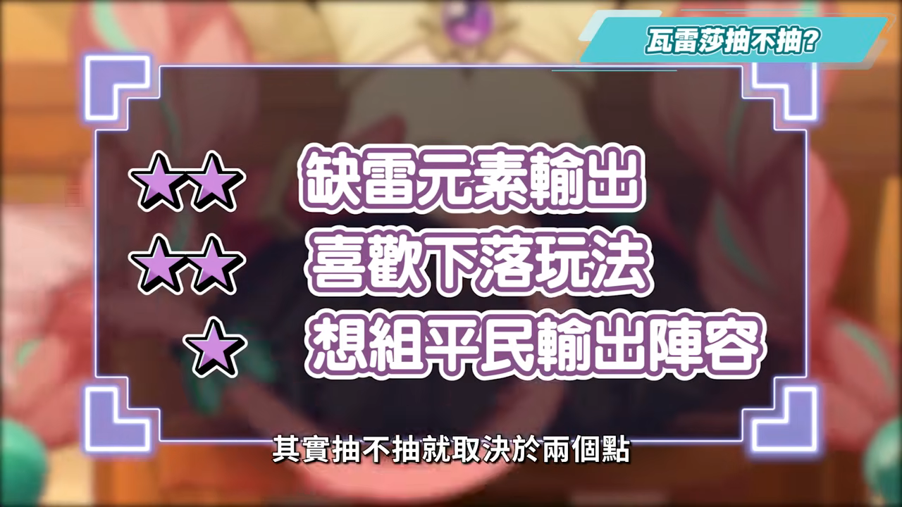 最後總結瓦雷莎抽不抽,瓦雷莎做為一個雷元素的下落輸出,其實抽不抽就取決於兩個點,一種是你需不需要雷元素輸出、另外一種就是你喜不喜歡玩下落攻擊,倘若兩者都中,那麼瓦雷莎就適合你抽取,並且瓦雷莎也可以用前面洛洛提到的超載隊伍,組成一隊傷害不輸給其他五星角色組成的陣容,相對也是一隊較為平民的選擇。