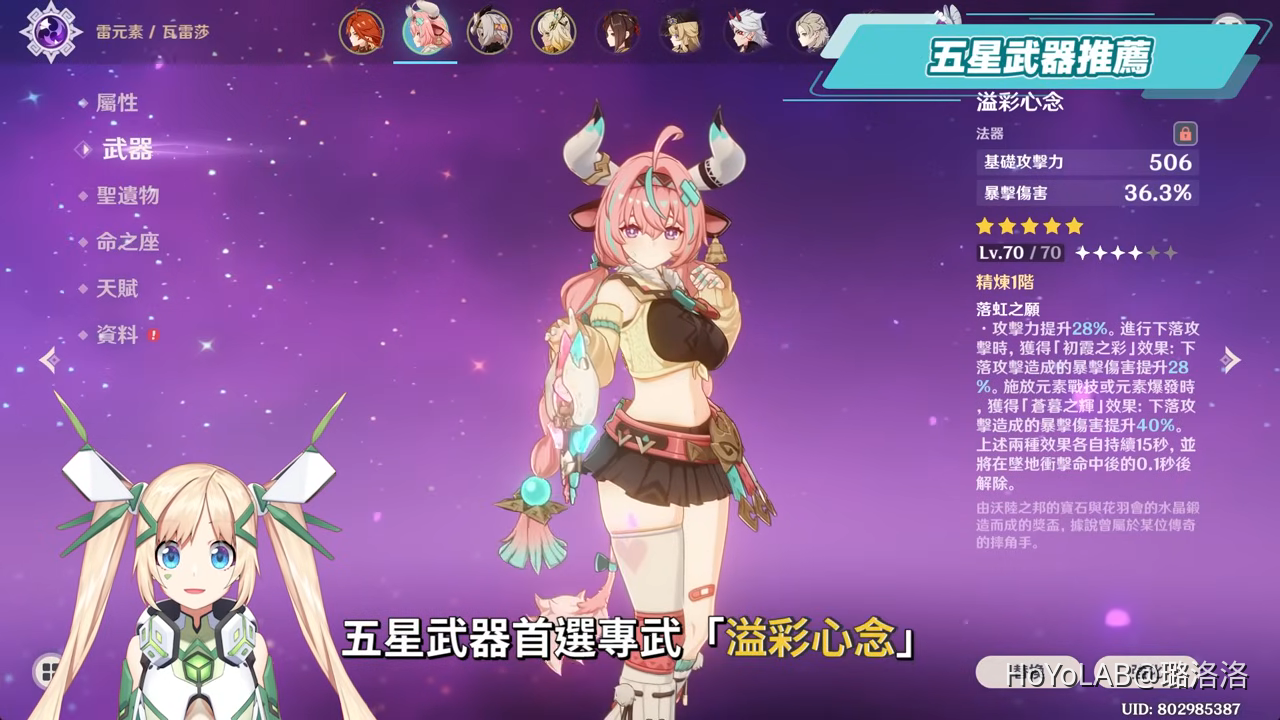 瓦雷莎的武器選擇方面,五星武器首選專武「溢彩心念」,在精煉1情況下就可以獲得44.1%暴傷、28%攻擊和68%下落攻擊的暴傷,搭配瓦雷莎在下落攻擊或EAAQ的循環中,都能提高對應傷害,也是最佳選擇。不過目前輸出向的法器上其實也有較多選擇,像是先前若是有抽閒雲專武「鶴鳴餘音」,也具備高額的基礎攻擊力、以及下落增傷與額外回能等效果,也正好和這次的卡池一起限時加倍,假如這次抽武器時歪了這把,至少還算是一個安慰獎。另外身為老玩家可能身上也會有高精煉的常駐五星法器「四風原典」,在高精煉的情況下,四風原典提供的傷害其實也不會和其他輸出法器差太多,加上下落的法器也不多,所以其實就算拿四風原典的情況下差距也不會太大,算是比較平民的老玩家選擇。其他也還有像是「神樂之真意」、「萬世流湧大典」、「衝浪時光」、「金流監督」、「圖萊度拉的回憶」等副屬性為雙暴的法器,可以補上瓦雷莎自身缺少的雙暴區,若不打算抽武器池,也可以看自己有什麼用什麼。