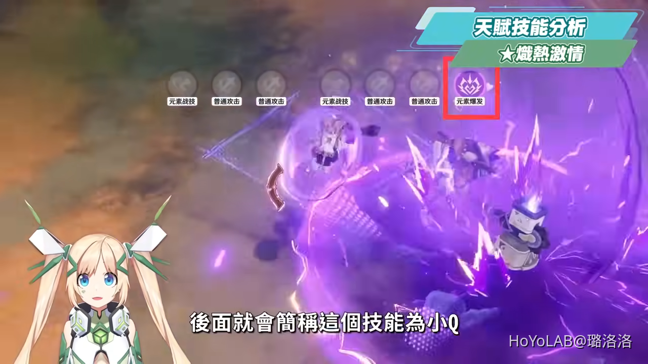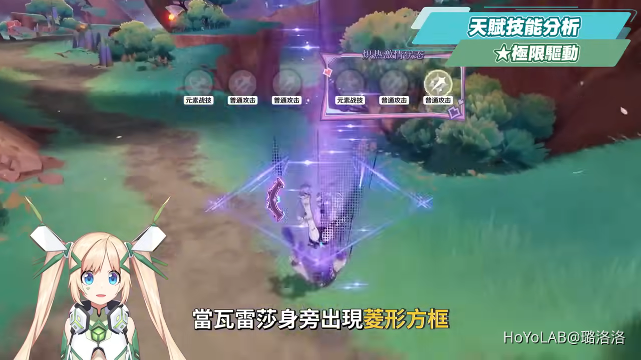 而「極限驅動」狀態主要就是提高瓦雷莎此狀態下的抗打斷能力,當瓦雷莎身旁出現菱形方框就表示有這個加強抗打斷能力的效果,讓瓦雷莎在下落攻擊的過程中不容易被打斷,同時只要聽到元素爆發能量好的音效後,就可以直接施放只要30點能量的小Q「大火山崩落」。
