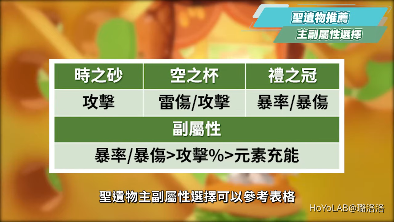 聖遺物主副屬性選擇可以參考表格,時之沙選擇攻擊,空之杯可選擇雷傷或是攻擊,兩者差距不多,尤其搭配芙寧娜增傷已經稀釋較多,可以選擇副詞條較好的杯子即可,禮之冠根據面板選擇暴率或暴傷配平。副詞條則多堆疊雙暴、攻擊力百分比與元素充能。