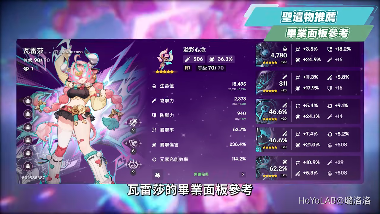 瓦雷莎的畢業面板參考,以「長夜之誓」的套裝來看,暴率建議在實戰中至少在70%~80%以上更好,確保每次下落攻擊都能吃到暴擊,暴傷越高越好,至少和暴率有1:2的比例,攻擊力至少2000以上、也因為Q大招對於瓦雷莎在實戰中的循環也有一定的重要性,因此元素充能若是在有搭配像是伊安珊這類的雙雷隊友,建議副詞條堆充能到125%~130%左右優化循環,但如果隊伍中只有瓦雷莎單雷,那可能就要至少140%~150%左右的元素充能會比較合適。