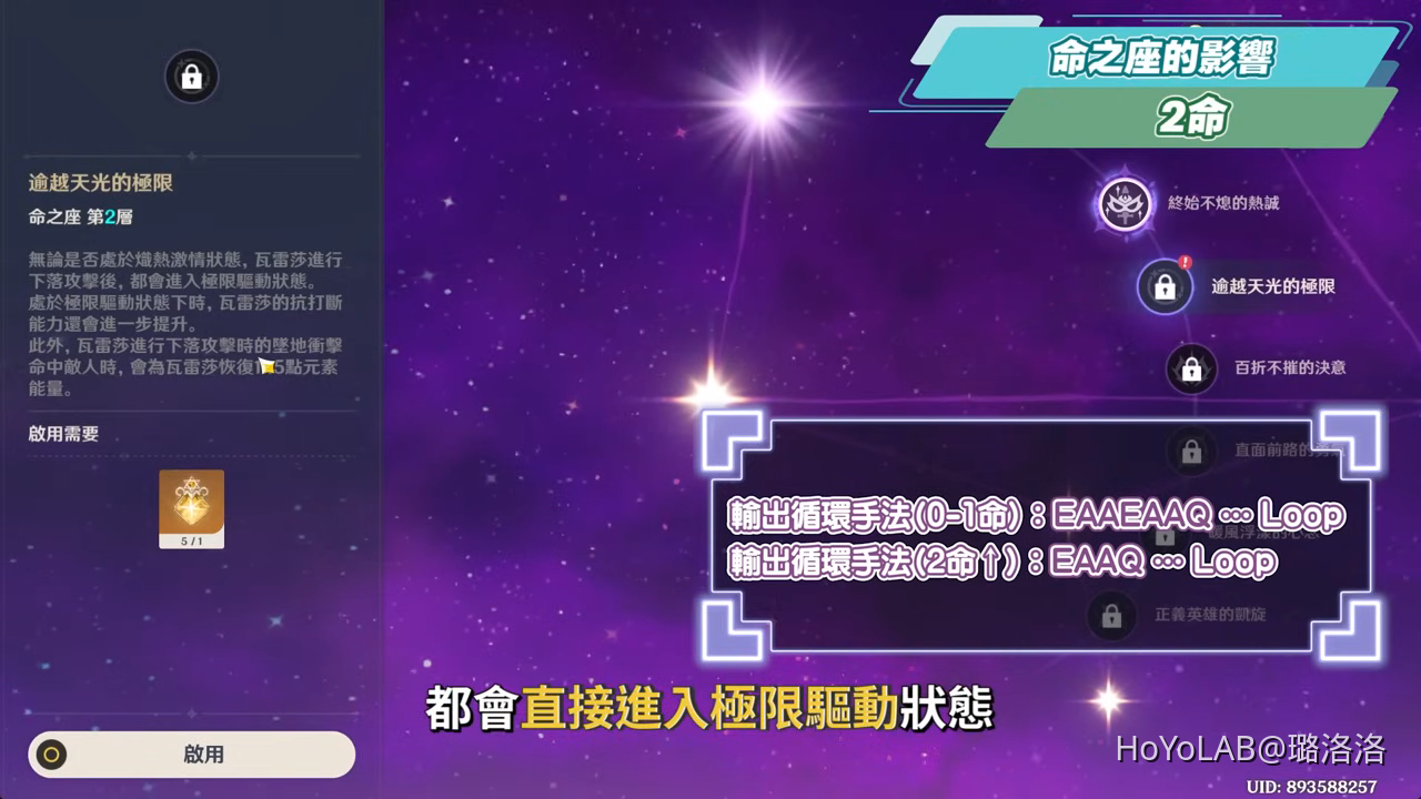2命就屬於是給瓦雷莎加強機制和傷害的命座效果,無論當前是否處於戴面具狀態,瓦雷莎開Q大招後的下落攻擊,都會直接進入極限驅動狀態,並且下落攻擊命中敵人時還可以回復能量,優化大招充能循環,原本瓦雷莎會需要經過2次EAA的循環,才能施放一次30能量的小Q,但只要解鎖2命後,每輪的輸出循環都可以打出EAAQ,搭配一輪爆發可以打出共6個循環,也從原本只能打3個小Q,翻倍到能在每輪爆發中打出6個小Q,並且也等於全程近乎霸體的抗打斷能力,是個各方面都提升明顯的命座。