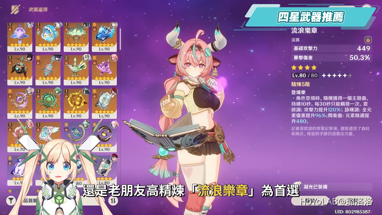 四星武器方面還是老朋友高精煉「流浪樂章」為首選,只是畢竟武器效果三選一還是會比較不穩定,因此洛洛還是會建議盡量以五星輸出法器為優先。真的再沒有,那就選擇像是其他老朋友,紀行武器中的「遺祀玉瓏」或是「匣裡日月」等等。