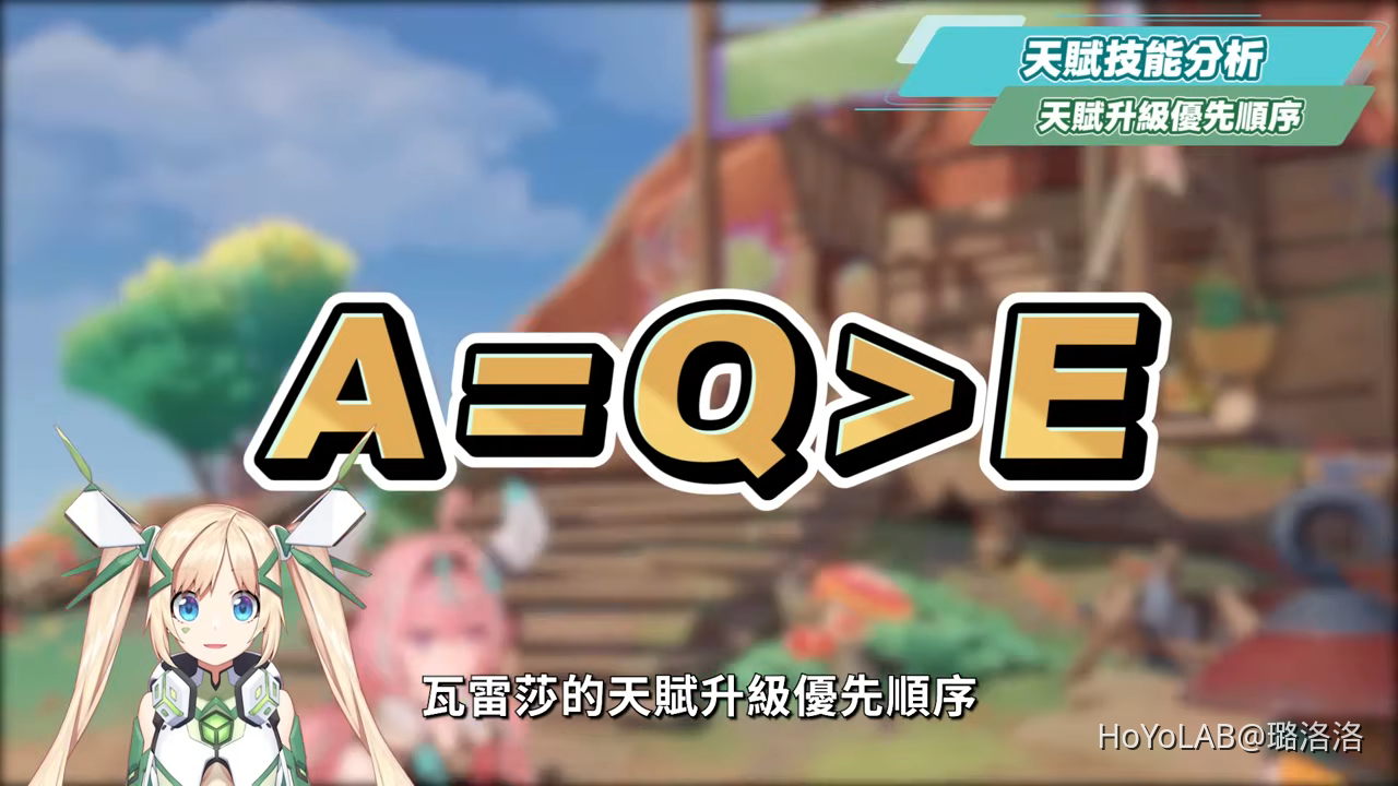 瓦雷莎的天賦升級優先順序,主要升級核心下落傷害的普攻以及小Q所在的元素爆發,戰技可以先升到6,後面再依照自己的資源狀況最後升級。