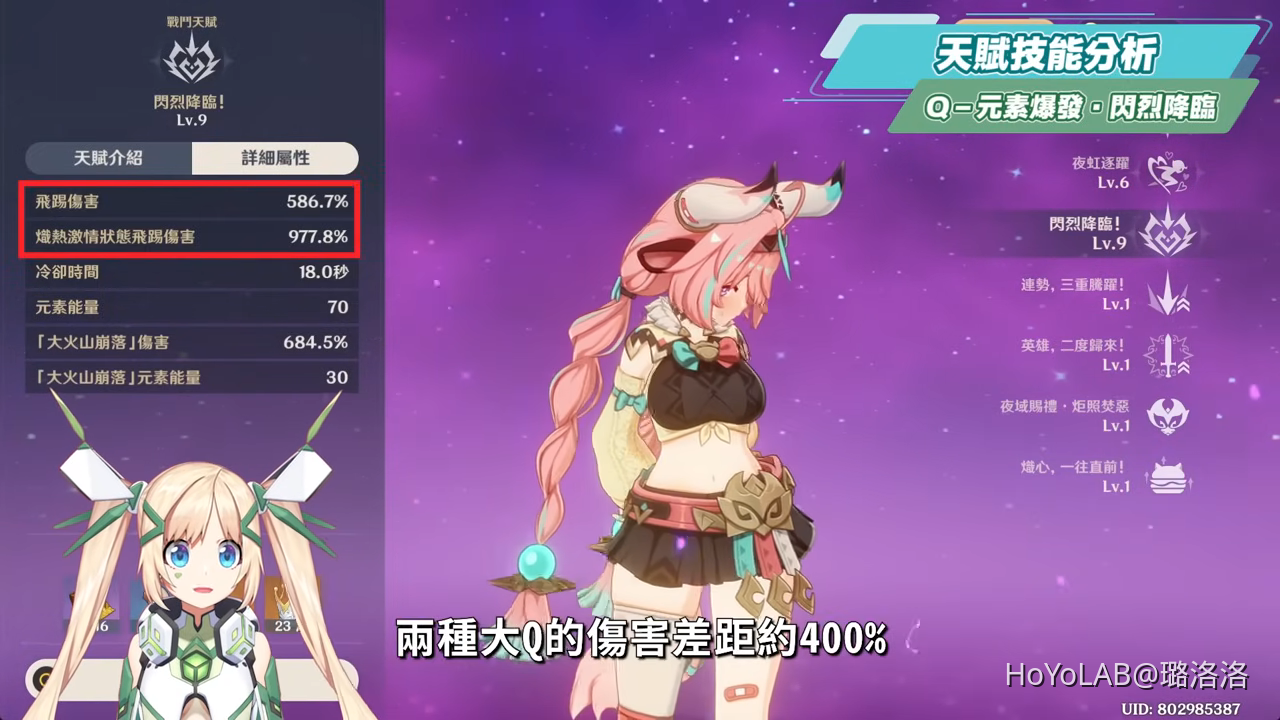 瓦雷莎的Q大招也同樣有兩種模組,施放完整能量的Q大招這邊簡稱大Q,雖然一般實戰中比較不太會用,不過還是介紹一下機制,大Q需要消耗70點能量,一種是在未戴面具的情況下開大Q,就會進行一次飛踢,而另外一種則是戴面具情況下開大Q,可以造成更大傷害的飛踢,兩種模組主要的差別體現在傷害倍率上,9級情況下,兩種大Q的傷害差距約400%,但大Q的傷害吃不到下落攻擊的加成,所以實戰中主要還是用待會要介紹的小Q。元素爆發中的另外一個小Q,也就是技能中提到的「大火山崩落」,也是實戰中最常使用到的,需要消耗30點能量,只要在戴面具的狀態下使用下落攻擊,就會在短暫時間中進入「極限驅動」狀態。