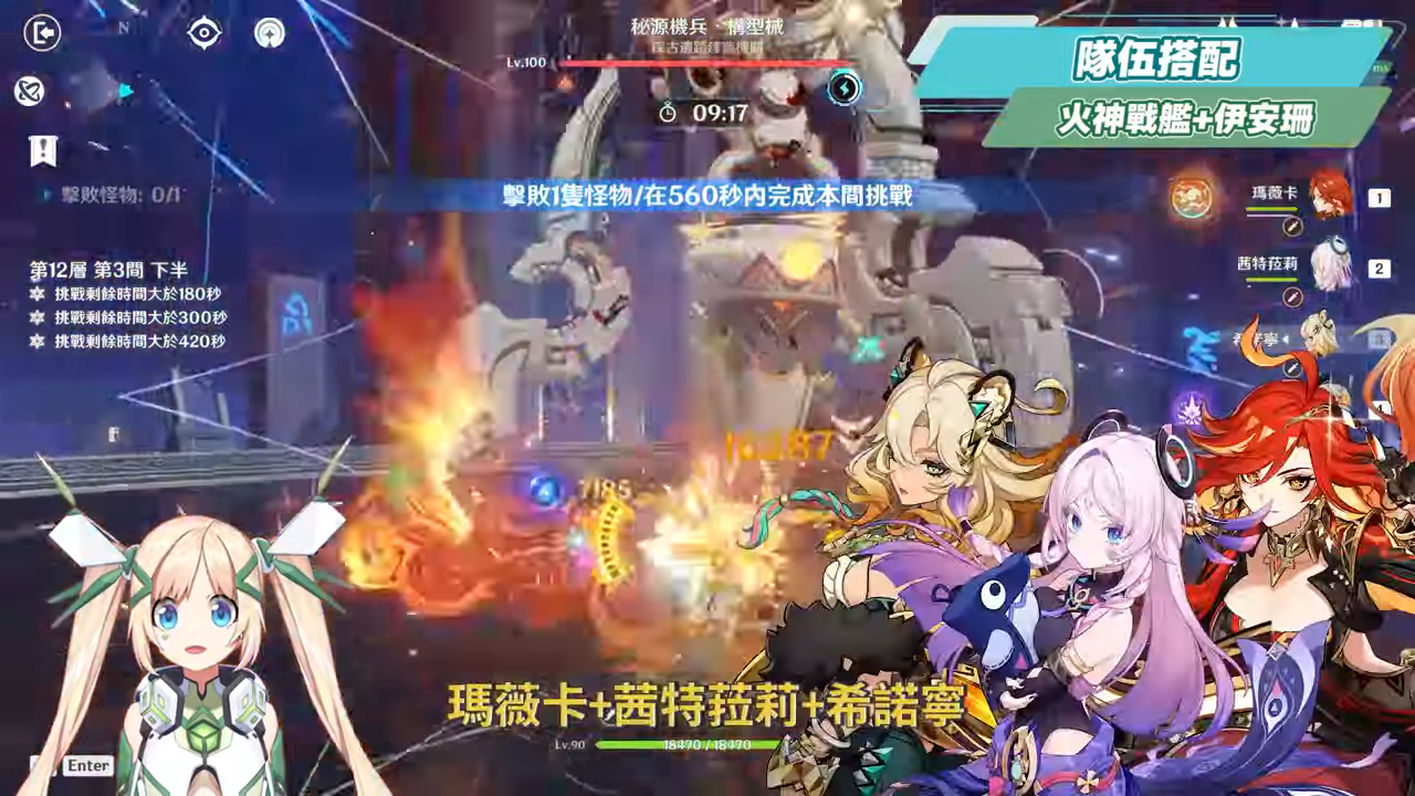 首先是瑪薇卡的相關實戰,組成為納塔戰艦瑪薇卡+茜特菈莉+希諾寧,再加上伊安珊,這隊對比班尼特因為會少了班尼特的6命火傷加成與雙火共鳴,因此在搭配伊安珊的傷害上會略低於搭配班尼特的組合,但搭配伊安珊的好處就是若怪物分布比較分散,伊安珊就可以讓瑪薇卡更好得去攜帶隨身BUFF攻擊敵人,在需要頻繁移動的情況下,伊安珊帶來的效果就會補起丟失班尼特圓圈範圍BUFF的損失缺口。