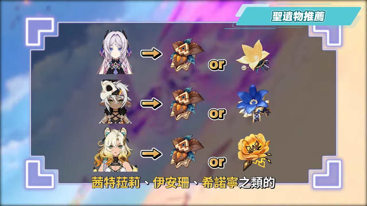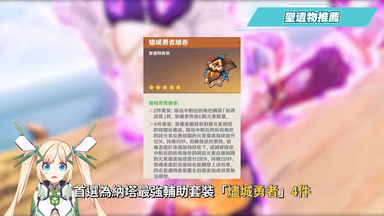 伊安珊的聖遺物推薦首選為納塔最強輔助套裝「燼城勇者」4件,直接提供40%的全增傷。要稍微注意的是搭配主C時,隊伍中一定要可以觸發主C元素的相關反應,像是輔助水/火/冰/雷/草元素主C。