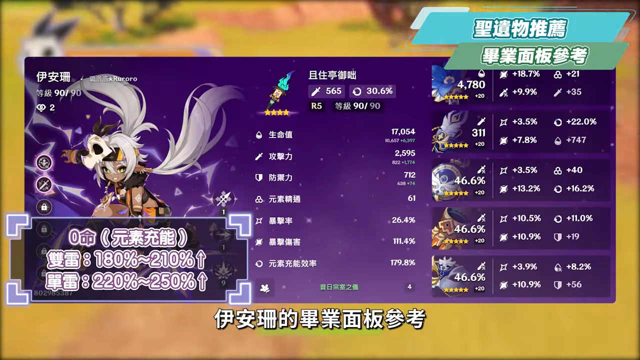 伊安珊的畢業面板參考,元素充能的部分,若是雙雷情況下可以大約在180%~210%左右,若是只有伊安珊一名單雷,那麼就會需要大約220%~240%。部分沒有群怪的單雷環境,可能會需要堆更多,盡可能250%~260%以上確保循環。