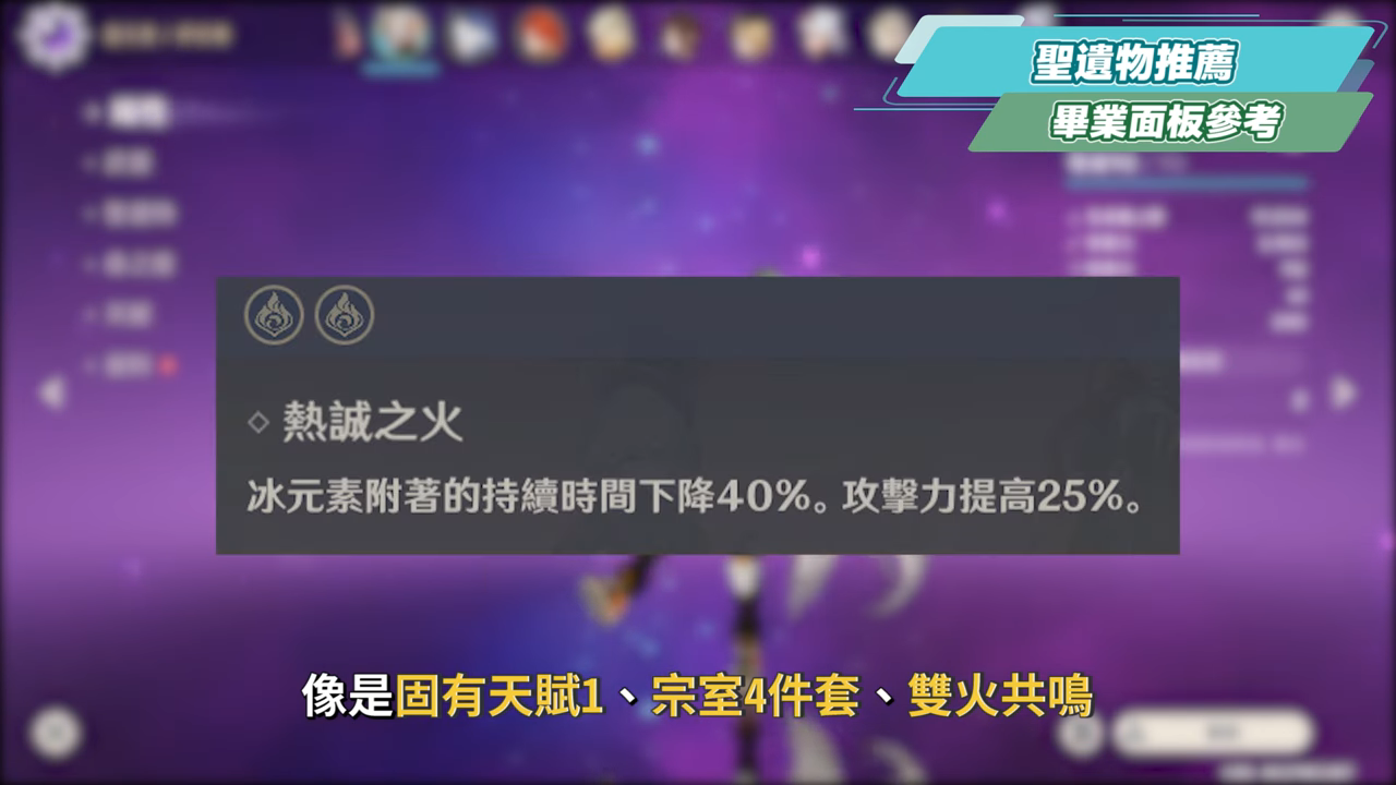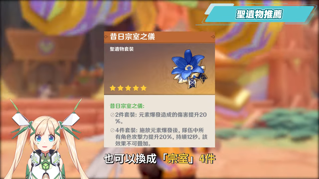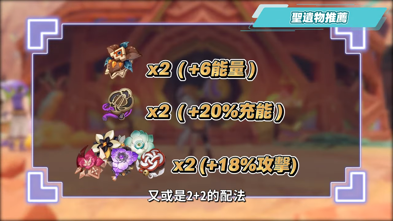 而若是隊伍中有其他角色也穿「燼城勇者」4件,或是無法觸發主C相關的元素反應時,例如搭配風元素輸出,也可以換成「宗室」4件。